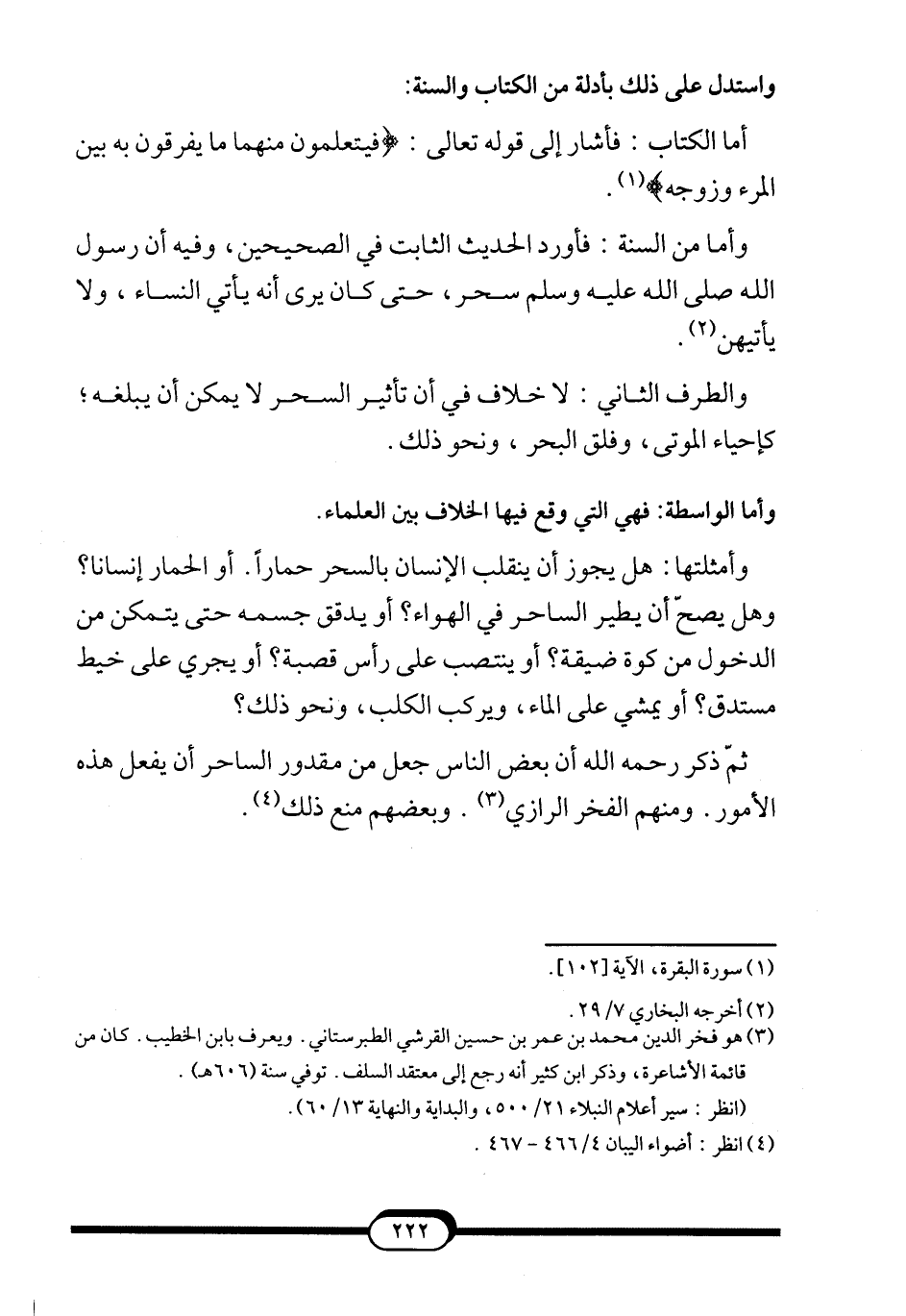 ثمّ ذكر -رحمه الله- أن بعض الناس جعل من مقدور الساحر أن يفعل هذه الأمور. ومنهم الفخر الرازي3. وبعضهم منع ذلك4.