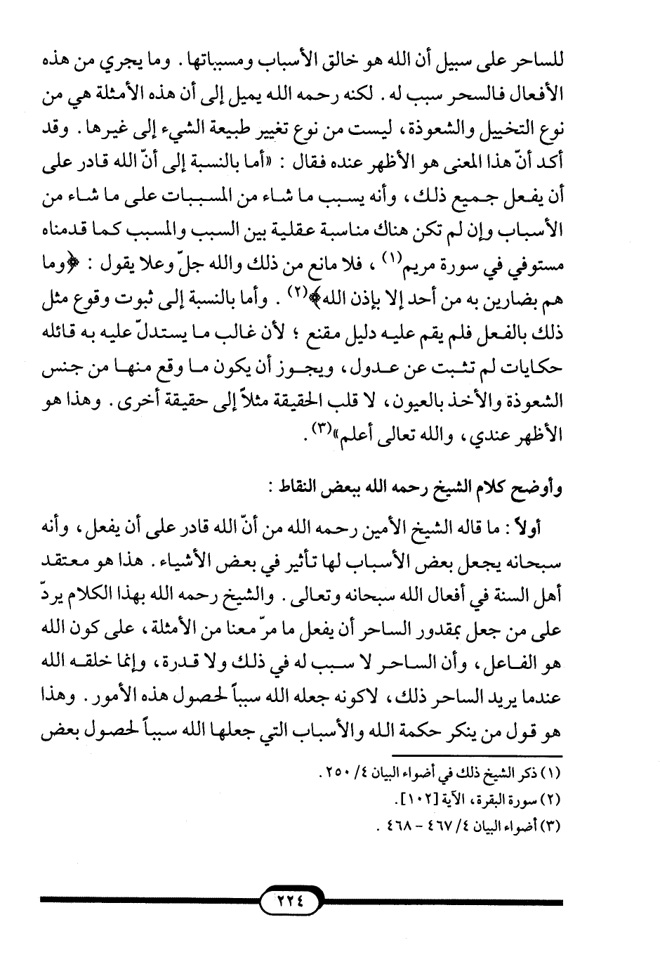 أولاً: ما قاله الشيخ الأمين -رحمه الله- من أنّ الله قادر على أن يفعل، وأنه سبحانه يجعل بعض الأسباب لها تأثير في بعض الأشياء. هذا هو معتقد أهل السنة في أفعال الله سبحانه وتعالى. والشيخ -رحمه الله- بهذا الكلام يردّ على من جعل بمقدور الساحر أن يفعل ما مرّ معنا من الأمثلة، على كون الله هو الفاعل، وأن الساحر لا سبب له في ذلك ولا قدرة، وإنما خلقه الله عندما يريد الساحر ذلك، لا كونه جعله سبباً لحصول هذه الأمور. وهذا هو قول من ينكر حكمة الله والأسباب التي جعلها سبباً لحصول بعض