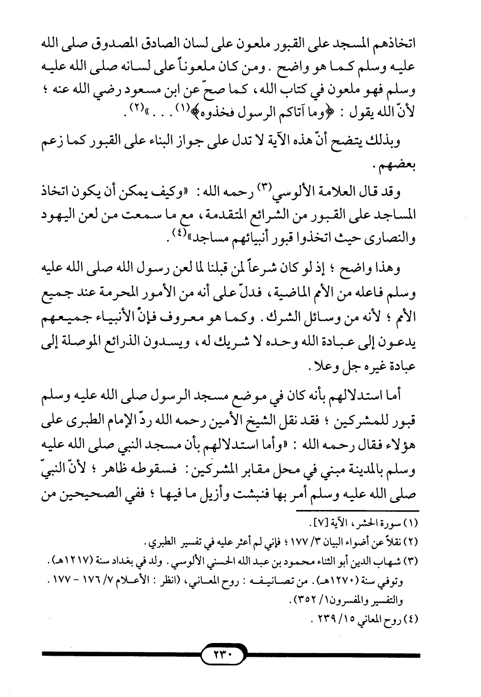 وقد قال العلامة الألوسي3 -رحمه الله-: "وكيف يمكن أن يكون اتخاذ المساجد على القبور من الشرائع المتقدمة، مع ما سمعت من لعن اليهود والنصارى حيث اتخذوا قبور أنبيائهم مساجد" 4.
