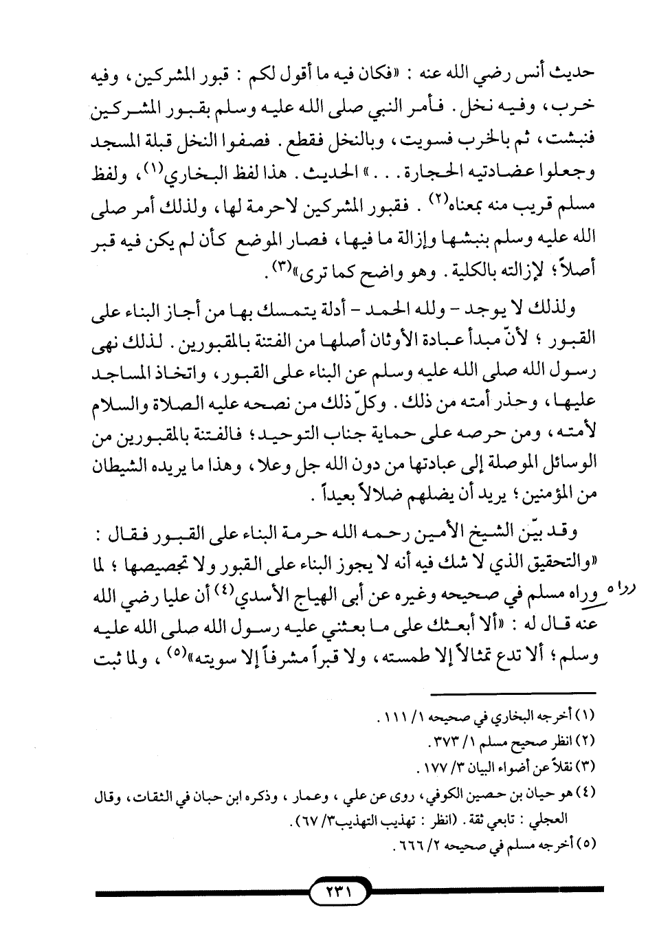 وقد بيّن الشيخ الأمين -رحمه الله- حرمة البناء على القبور فقال: "والتحقيق الذي لا شك فيه أنه لا يجوز البناء على القبور ولا تجصيصها؛ لما رواه مسلم في صحيحه وغيره عن أبي الهياج الأسدي4 أن علياً رضي الله عنه قال له: "ألا أبعثك على ما بعثني عليه رسول الله صلى الله عليه وسلم؛ ألا تدع تمثالاً إلا طمسته، ولا قبراً مشرفاً إلا سويته" 5، ولما ثبت