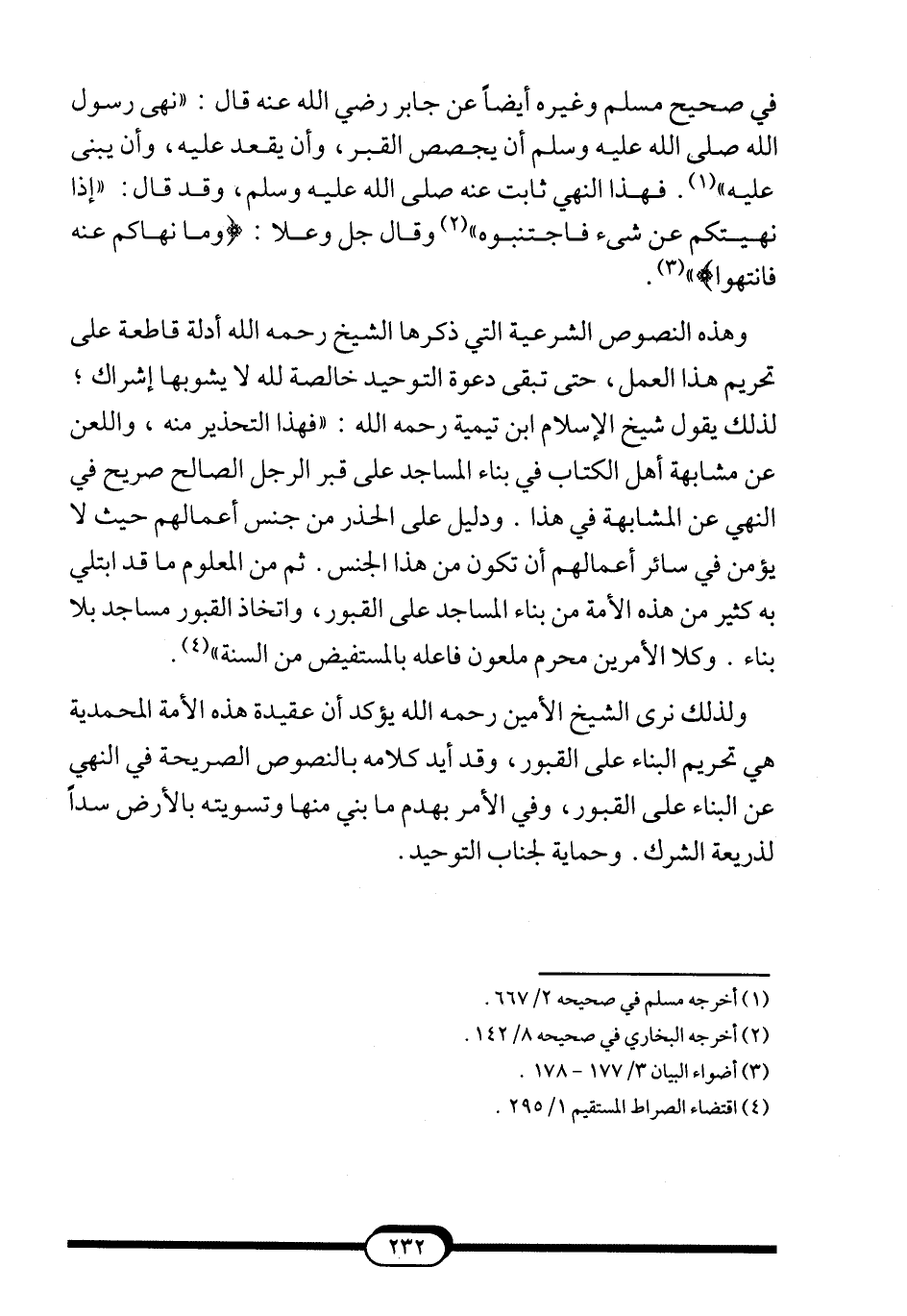 ولذلك نرى الشيخ الأمين -رحمه الله- يؤكد أن عقيدة هذه الأمة المحمدية هي تحريم البناء على القبور، وقد أيد كلامه بالنصوص الصريحة في النهي عن البناء على القبور، وفي الأمر بهدم ما بني منها وتسويته بالأرض سداً لذريعة الشرك. وحماية لجناب التوحيد.