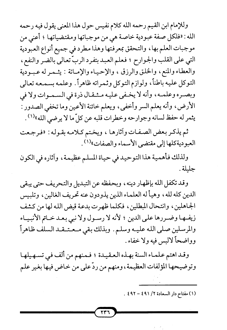 وللإمام ابن القيم -رحمه الله- كلام نفيس حول هذا المعنى يقول فيه -رحمه الله-: "فلكل صفة عبودية خاصة هي من موجباتها ومقتضياتها؛ أعني من موجبات العلم بها، والتحقق بمعرفتها وهذا مطرد في جميع أنواع العبودية التي على القلب والجوارح؛ فعلم العبد بتفرد الربّ تعالى بالضر والنفع، والعطاء والمنع، والخلق والرزق، والإحياء والإماتة: يثمر له عبودية التوكل عليه باطناً، ولوازم التوكل وثمراته ظاهراً. وعلمه بسمعه تعالى وبصره وعلمه، وأنه لا يخفى عليه مثقال ذرة في السموات ولا في الأرض، وأنه يعلم السر وأخفى، ويعلم خائنة الأعين وما تخفي الصدور: يثمر له حفظ لسانه وجوارحه وخطرات قلبه عن كلّ ما لا يرضي الله"1.