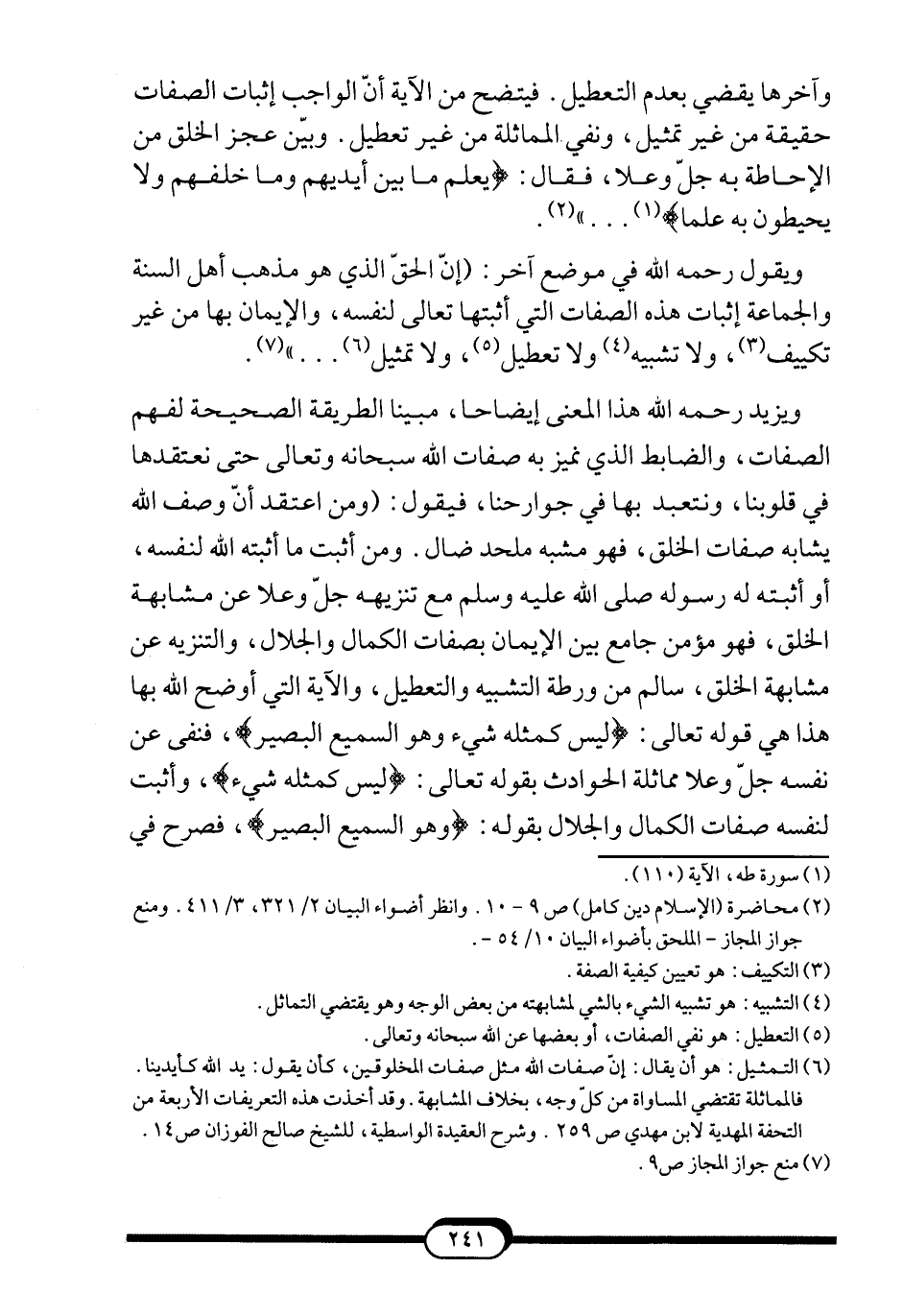 6 التمثيل: هو أن يقال: إنّ صفات الله مثل صفات المخلوقين، كأن يقول: يد الله كأيدينا. فالمماثلة تقتضي المساواة من كلّ وجه، بخلاف المشابهة. وقد أخذت هذه التعريفات الأربعة من التحفة المهدية لابن مهدي ص259. وشرح العقيدة الواسطية، للشيخ صالح الفوزان ص14.