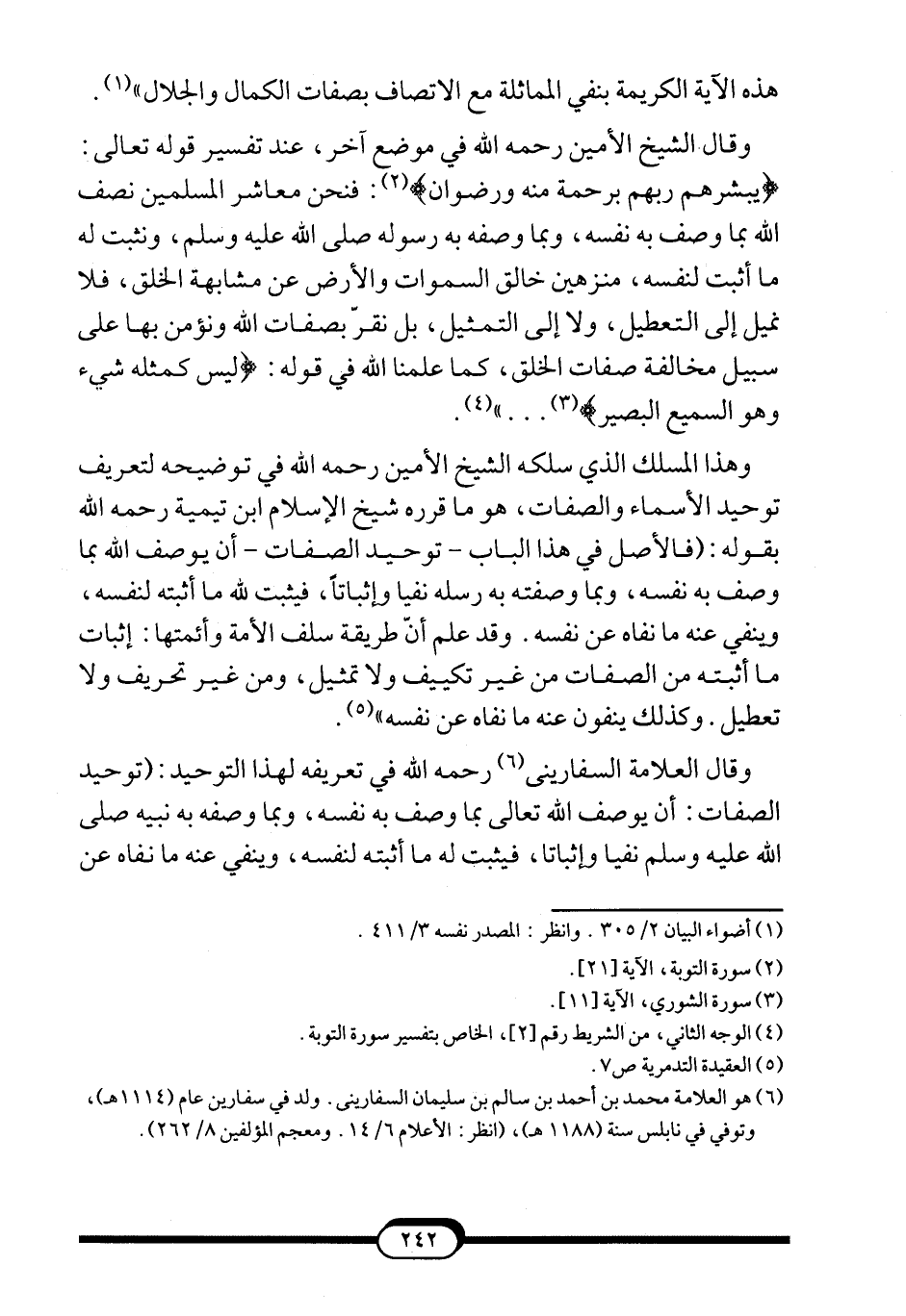 وقال الشيخ الأمين -رحمه الله- في موضع آخر، عند تفسير قوله تعالى: {يُبَشِّرُهُمْ رَبُّهُمْ بِرَحْمَةٍ مِنْهُ وَرِضْوَانٍ} 2: "فنحن معاشر المسلمين نصف الله بما وصف به نفسه، وبما وصفه به رسوله صلى الله عليه وسلم, ونثبت له ما أثبت لنفسه، منزهين خالق السموات والأرض عن مشابهة الخلق، فلا نميل إلى التعطيل، ولا إلى التمثيل، بل نقرّ بصفات الله ونؤمن بها على سبيل مخالفة صفات الخلق، كما علمنا الله في قوله: {لَيْسَ كَمِثْلِهِ شَيْءٌ وَهُوَ السَّمِيعُ الْبَصِيرُ} 3 ... "4.