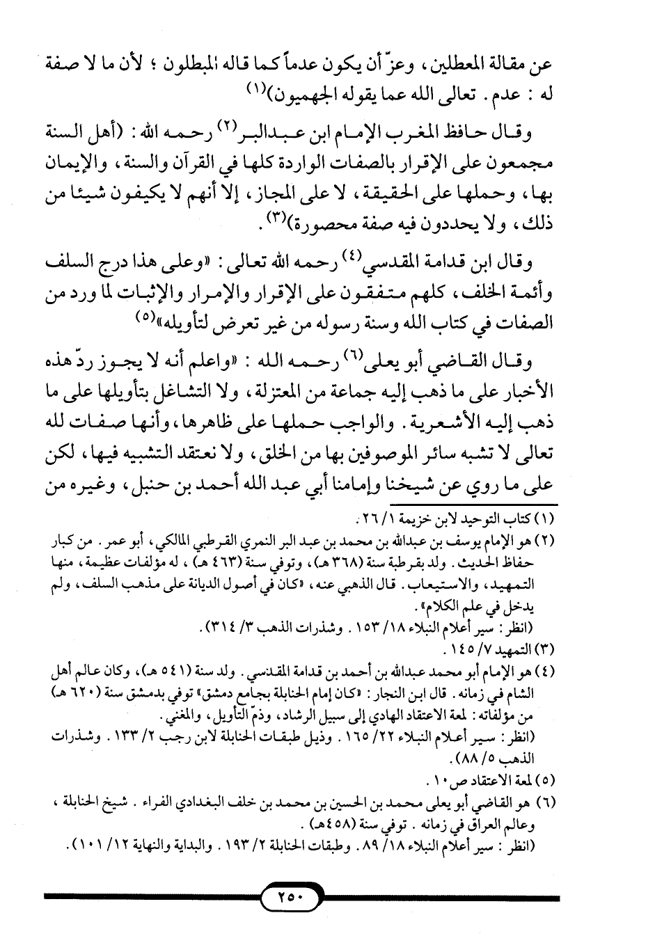 4 هو الإمام أبومحمد عبد الله بن أحمد بن قدامة المقدسي. ولد سنة (541?) ، وكان عالم أهل الشام في زمانه. قال ابن النجار: ((كان إمام الحنابلة بجامع دمشق)) توفي بدمشق سنة (620?) من مؤلفاته: لمعة الاعتقاد الهادي إلى سبيل الرشاد، وذمّ التأويل، والمغني.