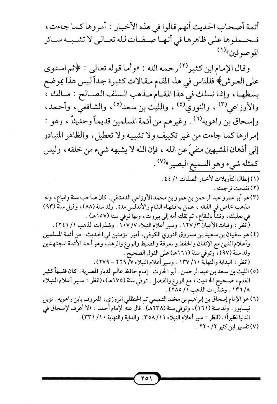 وقال الإمام ابن كثير2-رحمه الله-: "وأما قوله تعالى: {ثُمَّ اسْتَوَى عَلَى الْعَرْشِ} فللناس في هذا المقام مقالات كثيرة جداً ليس هذا بموضع بسطها، وإنما نسلك في هذا المقام مذهب السلف الصالح: مالك، والأوزاعي3، والثوري4، والليث بن سعد5، والشافعي، وأحمد، وإسحاق بن راهويه6. وغيرهم من أئمة المسلمين قديماً وحديثاً، وهو: إمرارها كما جاءت من غير تكييف ولا تشبيه ولا تعطيل، والظاهر المتبادر إلى أذهان المشبهين منفيّ عن الله، فإن الله لا يشبهه شيء من خلقه، وليس كمثله شيء وهو السميع البصير"7.