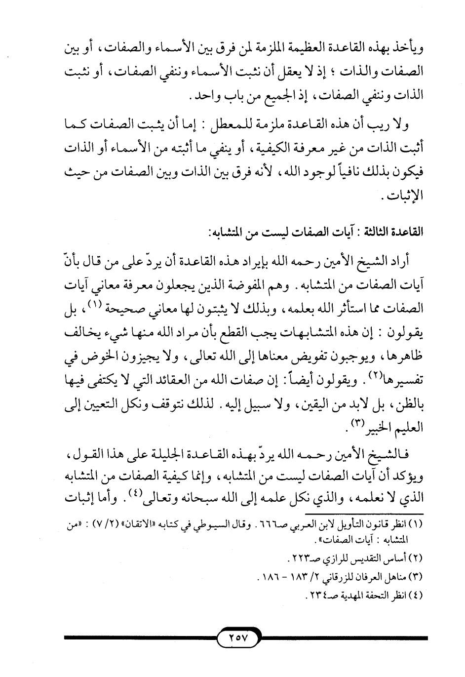 فالشيخ الأمين -رحمه الله- يردّ بهذه القاعدة الجليلة على هذا القول، ويؤكد أن آيات الصفات ليست من المتشابه، وإنما كيفية الصفات من المتشابه الذي لا نعلمه، والذي نكل علمه إلى الله سبحانه وتعالى4. وأما إثبات
