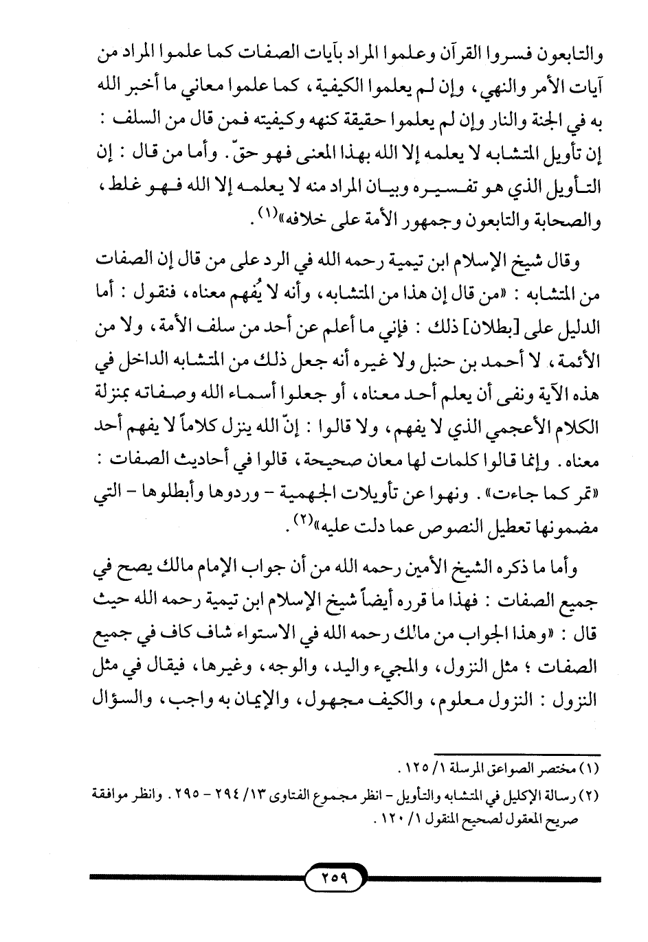 وقال شيخ الإسلام ابن تيمية -رحمه الله- في الرد على من قال إن الصفات من المتشابه: "من قال إن هذا من المتشابه، وأنه لايُفهم معناه، فنقول: أما الدليل على [بطلان] ذلك: فإني ما أعلم عن أحد من سلف الأمة، ولا من الأئمة، لا أحمد بن حنبل ولا غيره أنه جعل ذلك من المتشابه الداخل في هذه الآية ونفى أن يعلم أحد معناه، أو جعلوا أسماء الله وصفاته بمنزلة الكلام الأعجمي الذي لا يفهم، ولا قالوا: إنّ الله ينزل كلاماً لا يفهم أحد معناه. وإنما قالوا كلمات لها معان صحيحة، قالوا في أحاديث الصفات: "تمر كما جاءت". ونهوا عن تأويلات الجهمية –وردوها وأبطلوها- التي مضمونها تعطيل النصوص عما دلت عليه" 2.