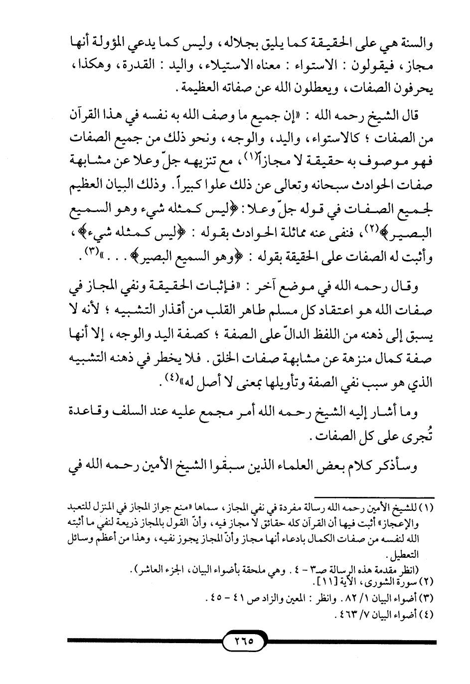 قال الشيخ -رحمه الله-: "إن جميع ما وصف الله به نفسه في هذا القرآن من الصفات؛ كالاستواء، واليد، والوجه، ونحو ذلك من جميع الصفات فهو موصوف به حقيقة لا مجازاً1، مع تنزيهه جلّ وعلا عن مشابهة صفات الحوادث سبحانه وتعالى عن ذلك علوا كبيراً. وذلك البيان العظيم لجميع الصفات في قوله جلّ وعلا: {لَيْسَ كَمِثْلِهِ شَيْءٌ وَهُوَ السَّمِيعُ الْبَصِيرُ} 2، فنفى عنه مماثلة الحوادث بقوله: {لَيْسَ كَمِثْلِهِ شَيْءٌ} ، وأثبت