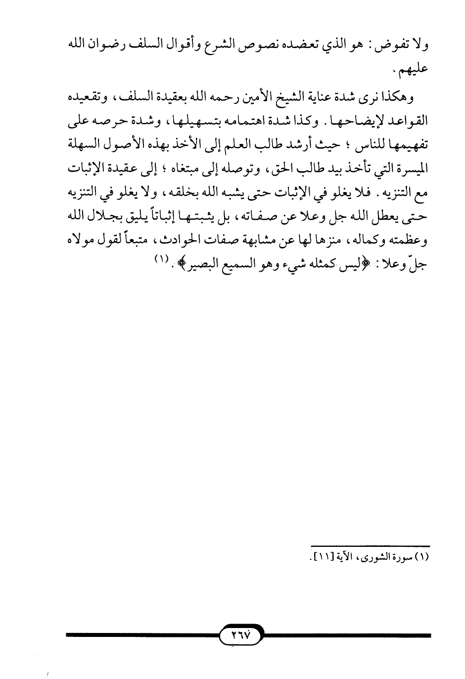 وهكذا نرى شدة عناية الشيخ الأمين –رحمه الله- بعقيدة السلف، وتقعيده القواعد لإيضاحها. وكذا شدة اهتمامه بتسهيلها، وشدة حرصه على تفهيمها للناس؛ حيث أرشد طالب العلم إلى الأخذ بهذه الأصول السهلة الميسرة التي تأخذ بيد طالب الحق، وتوصله إلى مبتغاه؛ إلى عقيدة الإثبات مع التنزيه. فلا يغلو في الإثبات حتى يشبه الله بخلقه، ولا يغلو في التنزيه حتى يعطل الله جلّ وعلا عن صفاته، بل يثبتها إثباتاً يليق بجلال الله وعظمته وكماله، منزها لها عن مشابهة صفات الحوادث، متبعاً لقول مولاه جلّ وعلا: {لَيْسَ كَمِثْلِهِ شَيْءٌ وَهُوَ السَّمِيعُ الْبَصِيرُ} 1.
