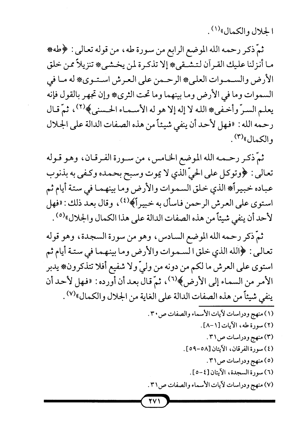 ثمّ ذكر -رحمه الله- الموضع الخامس؛ من سورة الفرقان، وهو قوله تعالى: {وَتَوَكَّلْ عَلَى الْحَيِّ الَّذِي لا يَمُوتُ وَسَبِّحْ بِحَمْدِهِ وَكَفَى بِهِ بِذُنُوبِ عِبَادِهِ خَبِيرا الَّذِي خَلَقَ السَّمَاوَاتِ وَالأرْضَ وَمَا بَيْنَهُمَا فِي سِتَّةِ أَيَّامٍ ثُمَّ اسْتَوَى عَلَى الْعَرْشِ الرَّحْمَنُ فَاسْأَلْ بِهِ خَبِيراً} 4. وقال بعد ذلك: "فهل لأحد أن ينفي شيئاً من هذه الصفات الدالة على الجلال والكمال" 5.