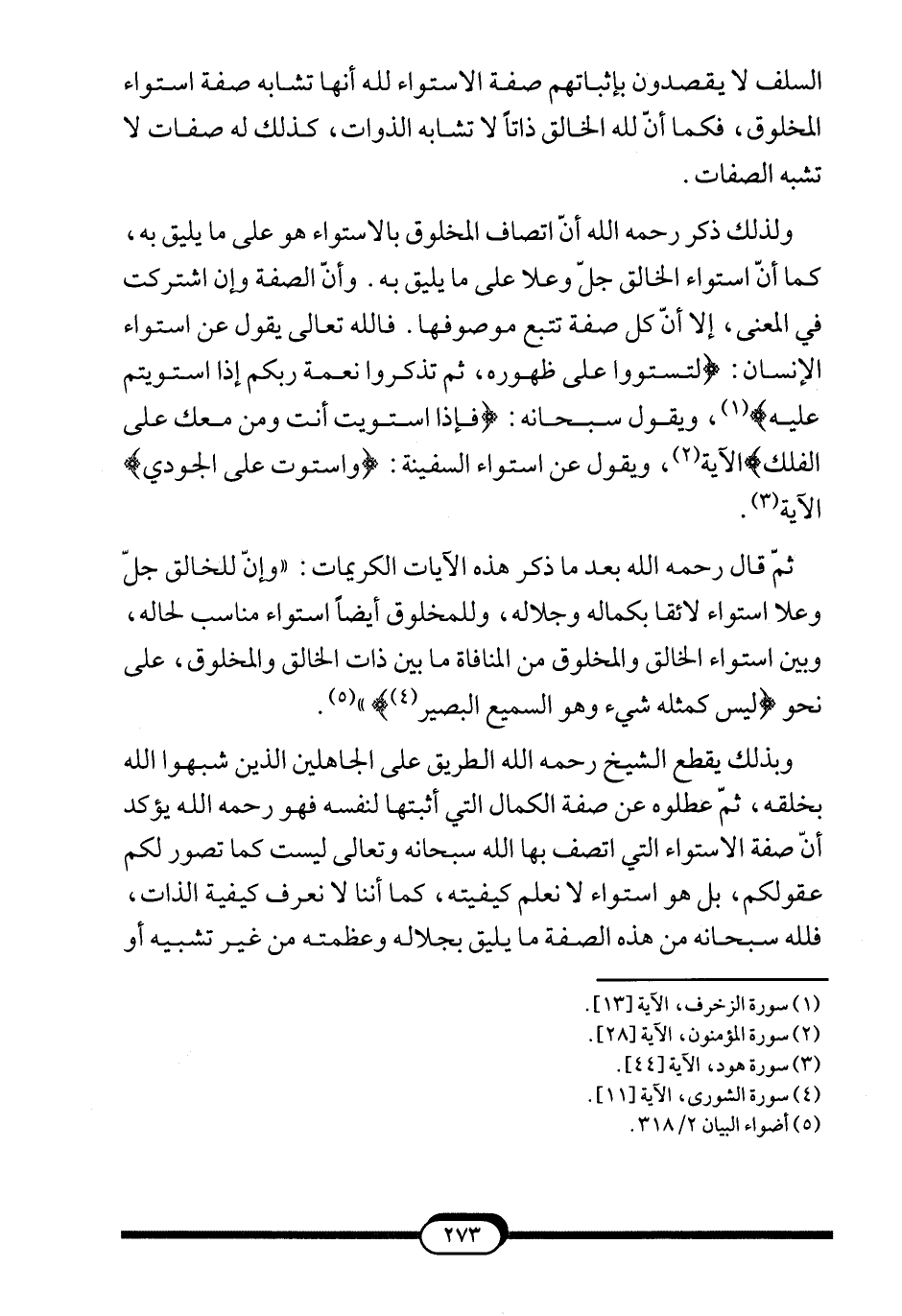 ولذلك ذكر -رحمه الله- أنّ اتصاف المخلوق بالاستواء هو على ما يليق به، كما أنّ استواء الخالق جلّ وعلا على ما يليق به. وأنّ الصفة وإن اشتركت في المعنى، إلا أنّ كل صفة تتبع موصوفها. فالله تعالى يقول عن استواء الإنسان: {لِتَسْتَوُوا عَلَى ظُهُورِهِ ثُمَّ تَذْكُرُوا نِعْمَةَ رَبِّكُمْ إِذَا اسْتَوَيْتُمْ عَلَيْهِ} 1، ويقول سبحانه: {فَإِذَا اسْتَوَيْتَ أَنْتَ وَمَنْ مَعَكَ عَلَى الْفُلْكِ} الآية2، ويقول عن استواء السفينة: {وَاسْتَوَتْ عَلَى الْجُودِيِّ} الآية3.
