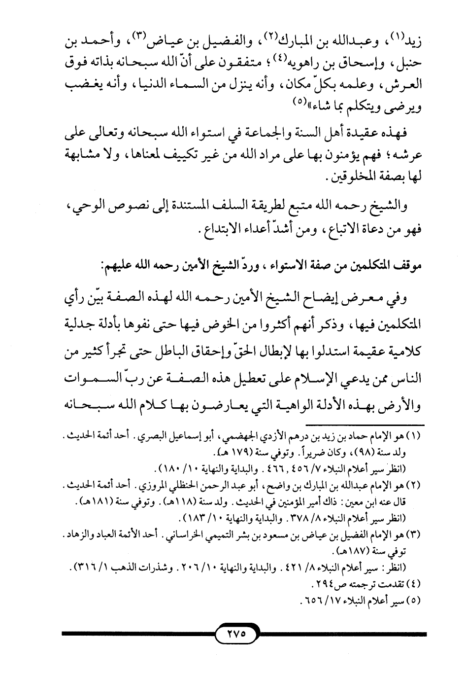 زيد1، وعبد الله بن المبارك2، والفضيل بن عياض3، وأحمد بن حنبل، وإسحاق بن راهويه4؛ متفقون على أنّ الله سبحانه بذاته فوق العرش، وعلمه بكلّ مكان، وأنه ينزل من السماء الدنيا، وأنه يغضب ويرضى ويتكلم بما شاء" 5.