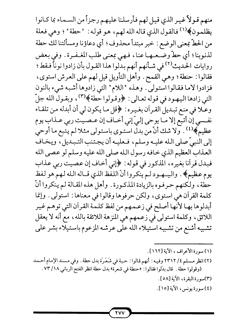 مِنْهُمْ قَوْلاً غَيْرَ الَّذِي قِيلَ لَهُمْ فَأَرْسَلْنَا عَلَيْهِمْ رِجْزاً مِنَ السَّمَاءِ بِمَا كَانُوا يَظْلِمُونَ} 1 فالقول الذي قاله الله لهم، هو قوله: "حطة"؛ وهي فعلة من الحطّ بمعنى الوضع: خبر مبتدأ محذوف؛ أي دعاؤنا ومسألتنا لك حطة لذنوبنا؛ أي حطّ وضعها عنا، فهي بمعنى طلب المغفرة. وفي بعض روايات الحديث2 في شأنهم أنهم بدلوا هذا القول بأن زادوا نوناً فقط، فقالوا: حنطة؛ وهي القمح. وأهل التأويل قيل لهم على العرش استوى، فزادوا لاما فقالوا استولى. وهذه "اللام" التي زادوها أشبه شيء بالنون التي زادها اليهود في قوله تعالى: {وَقُولُوا حِطَّةٌ} 3، وبقول الله جلّ وعلا في منع تبديل القرآن بغيره: {قُلْ مَا يَكُونُ لِي أَنْ أُبَدِّلَهُ مِنْ تِلْقَاءِ نَفْسِي إِنْ أَتَّبِعُ إِلاّ مَا يُوحَى إِلَيَّ إِنِّي أَخَافُ إِنْ عَصَيْتُ رَبِّي عَذَابَ يَوْمٍ عَظِيمٍ} 4. ولا شك أنّ من بدل استوى باستولى مثلا لم يتبع ما أوحي إلى النبي صلى الله عليه وسلم, فعليه أن يجتنب التبديل، ويخاف العذاب العظيم الذي خافه رسول الله صلى الله عليه وسلم لو عصى الله فبدل قرآنا بغيره، المذكور في قوله: {قُلْ إِنِّي أَخَافُ إِنْ عَصَيْتُ رَبِّي عَذَابَ يَوْمٍ عَظِيمٍ} . واليهود لم ينكروا أنّ اللفظ الذي قاله الله لهم هو لفظ حطة، ولكنهم حرفوه بالزيادة المذكورة، وأهل هذه المقالة لم ينكروا أنّ كلمة القرآن هي استوى، ولكن حرفوها وقالوا في معناها: استولى. وإنما أبدلوها بها لأنها أصلح في زعمهم من لفظ كلمة القرآن التي توهم غير اللائق، وكلمة استولى في زعمهم هي المنزهة اللائقة بالله، مع أنه لا يعقل تشبيه أشنع من تشبيه استيلاء الله على عرشه المزعوم باستيلاء بشر على