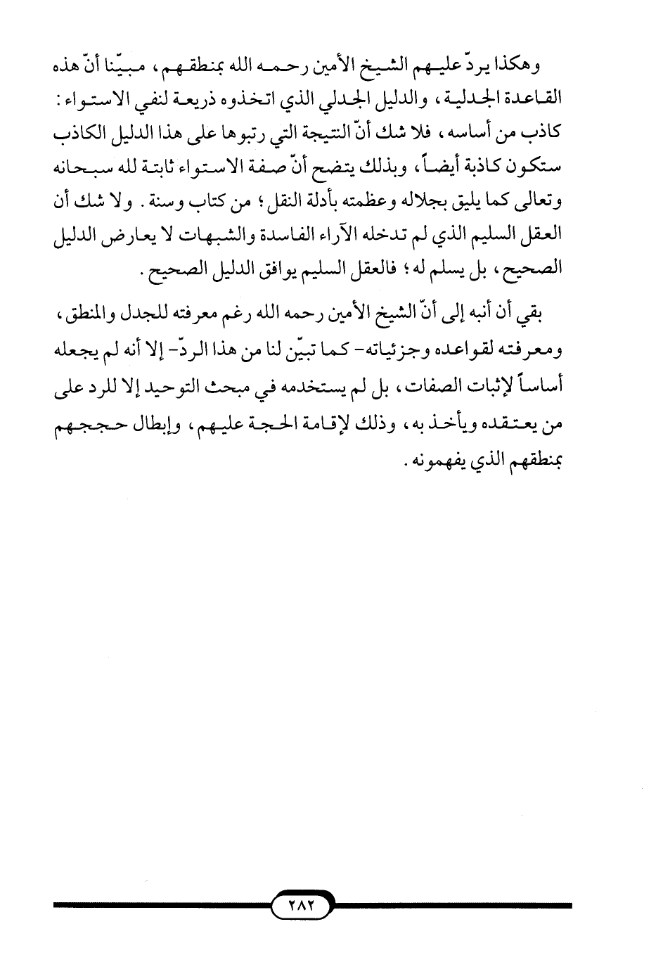 وهكذا يردّ عليهم الشيخ الأمين –رحمه الله- بمنطقهم، مبيّنا أنّ هذه القاعدة الجدلية، والدليل الجدلي الذي اتخذوه ذريعة لنفي الاستواء: كاذب من أساسه، فلا شك أنّ النتيجة التي رتبوها على هذا الدليل الكاذب ستكون كاذبة أيضاً، وبذلك يتضح أنّ صفة الاستواء ثابتة لله سبحانه وتعالى كما يليق بجلاله وعظمته بأدلة النقل؛ من كتاب وسنة. ولا شك أن العقل السليم الذي لم تدخله الآراء الفاسدة والشبهات لا يعارض الدليل الصحيح، بل يسلم له؛ فالعقل السليم يوافق الدليل الصحيح.