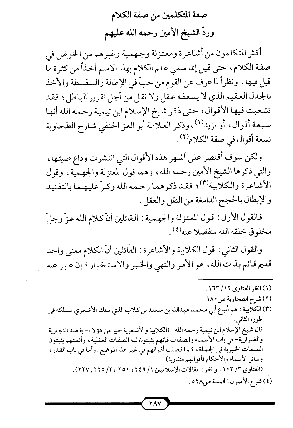 ولكن سوف أقتصر على أشهر هذه الأقوال التي انتشرت وذاع صيتها، والتي ذكرها الشيخ الأمين -رحمه الله-، وهما قول المعتزلة والجهمية، وقول الأشاعرة والكلابية3؛ فقد ذكرهما -رحمه الله- وكرّ عليهما بالتفنيد والإبطال بالحجج الدامغة من النقل والعقل.