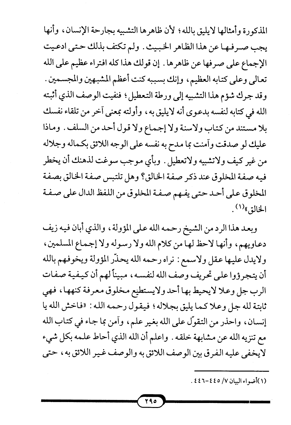 المذكورة وأمثالها لا يليق بالله؛ لأن ظاهرها التشبيه بجارحة الإنسان، وأنها يجب صرفها عن هذا الظاهر الخبيث. ولم تكتف بذلك حتى ادعيت الإجماع على صرفها عن ظاهرها. إن قولك هذا كله افتراء عظيم على الله تعالى وعلى كتابه العظيم، وإنك بسببه كنت أعظم المشبهين والمجسمين. وقد جرك شؤم هذا التشبيه إلى ورطة التعطيل؛ فنفيت الوصف الذي أثبته الله في كتابه لنفسه بدعوى أنه لا يليق به، وأولته بمعنى آخر من تلقاء نفسك بلا مستند من كتاب ولا سنة ولا إجماع ولا قول أحد من السلف. وماذا عليك لو صدقت وآمنت بما مدح به نفسه على الوجه اللائق بكماله وجلاله من غير كيف ولا تشبيه ولا تعطيل. وبأي موجب سوغت لذهنك أن يخطر فيه صفة المخلوق عند ذكر صفة الخالق؟ وهل تلتبس صفة الخالق بصفة المخلوق على أحد حتى يفهم صفة المخلوق من اللفظ الدال على صفة الخالق"1.