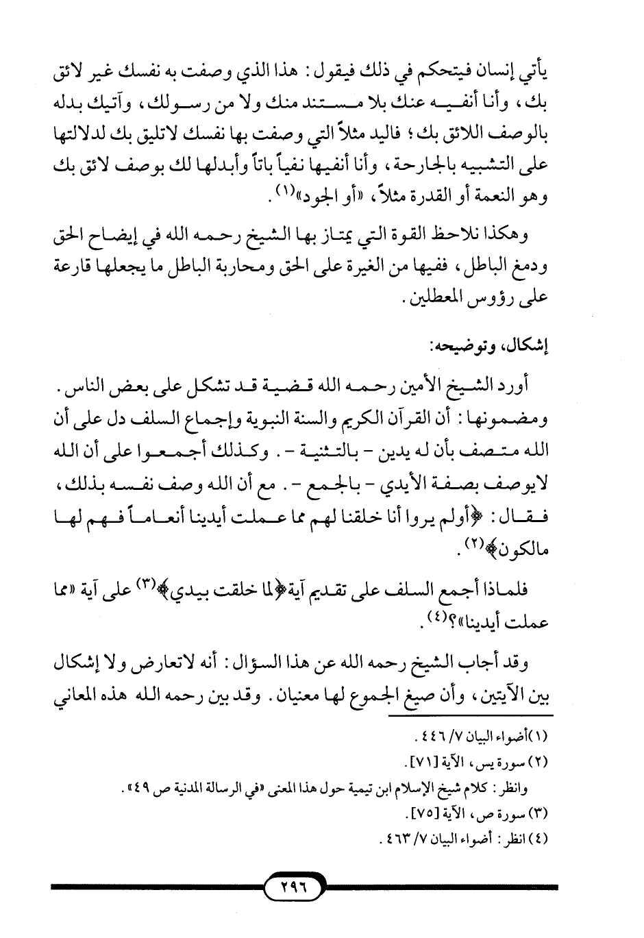 أورد الشيخ الأمين -رحمه الله- قضية قد تشكل على بعض الناس. ومضمونها: أن القرآن الكريم والسنة النبوية وإجماع السلف دل على أن الله متصف بأن له يدين –بالتثنية-. وكذلك أجمعوا على أن الله لايوصف بصفة الأيدي –بالجمع-. مع أن الله وصف نفسه بذلك، فقال: {أَوَلَمْ يَرَوْا أَنَّا خَلَقْنَا لَهُمْ مِمَّا عَمِلَتْ أَيْدِينَا أَنْعَاماً فَهُمْ لَهَا مَالِكُونَ} 2.