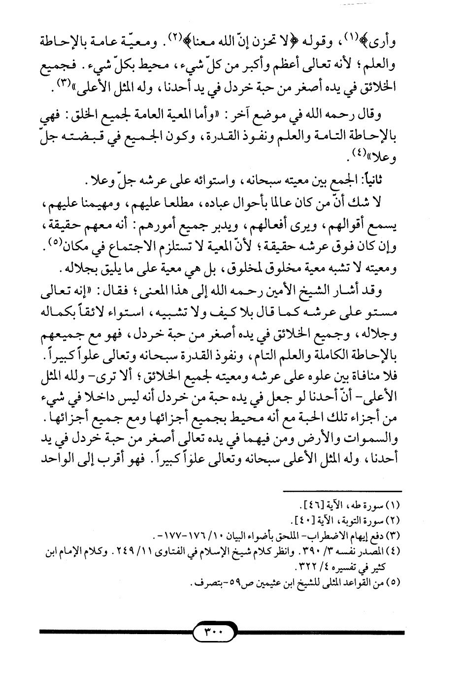 وَأَرَى} 1، وقوله: {لا تَحْزَنْ إِنَّ اللَّهَ مَعَنَا} 2. ومعيّة عامة بالإحاطة والعلم؛ لأنه تعالى أعظم وأكبر من كلّ شيء، محيط بكلّ شيء. فجميع الخلائق في يده أصغر من حبة خردل في يد أحدنا، وله المثل الأعلى"3.