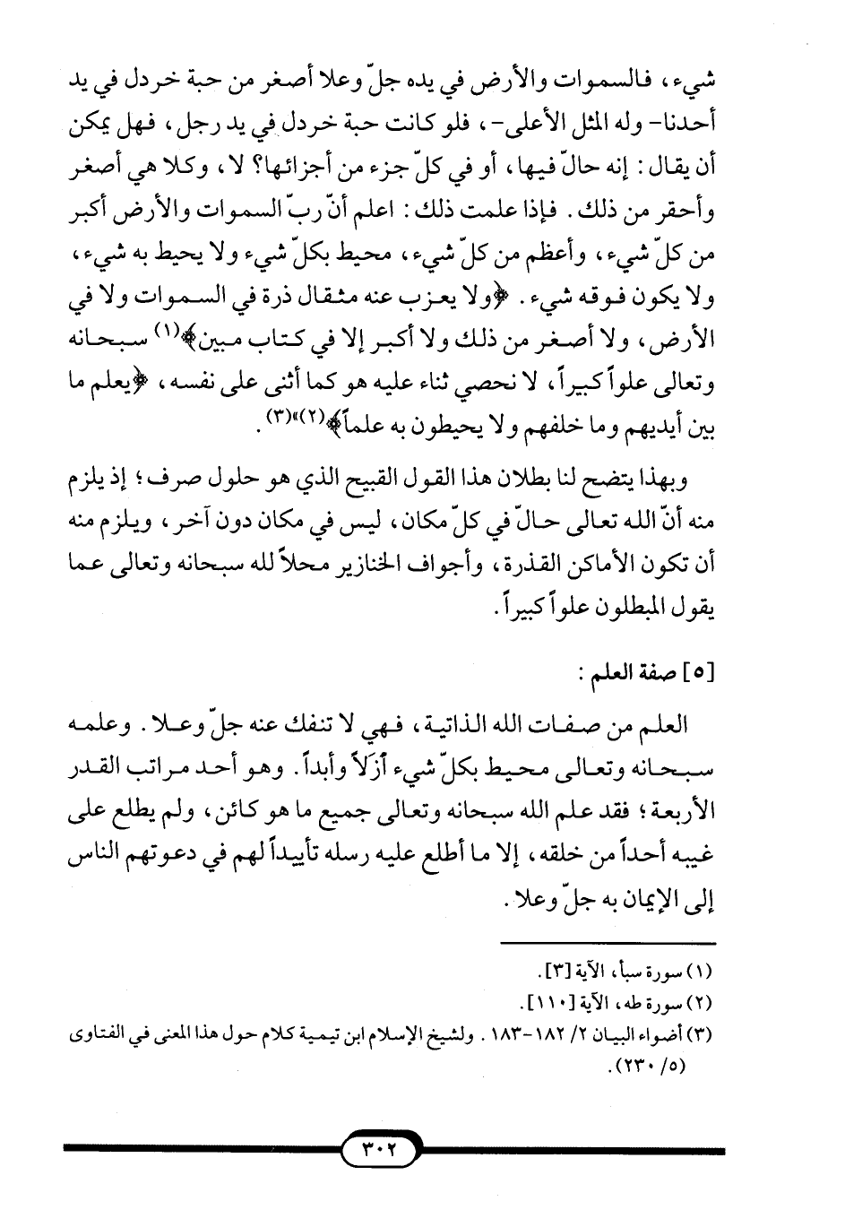 شيء، فالسموات والأرض في يده جل وعلا أصغر من حبة خردل في يد أحدنا –وله المثل الأعلى-، فلو كانت حبة خردل في يد رجل، فهل يمكن أن يقال: إنه حالّ فيها، أو في كلّ جزء من أجزائها؟ لا، وكلا هي أصغر وأحقر من ذلك. فإذا علمت ذلك: اعلم أنّ ربّ السموات والأرض أكبر من كلّ شيء، وأعظم من كلّ شيء، محيط بكلّ شيء ولا يحيط به شيء، ولا يكون فوقه شيء. {لا يَعْزُبُ عَنْهُ مِثْقَالُ ذَرَّةٍ فِي السَّمَاوَاتِ وَلا فِي الأرْضِ وَلا أَصْغَرُ مِنْ ذَلِكَ وَلا أَكْبَرُ إِلاّ فِي كِتَابٍ مُبِينٍ} 1 سبحانه وتعالى علواً كبيراً، لا نحصي ثناء عليه هو كما أثنى على نفسه، {يَعْلَمُ مَا بَيْنَ أَيْدِيهِمْ وَمَا خَلْفَهُمْ وَلا يُحِيطُونَ بِهِ عِلْماً} 2"3.