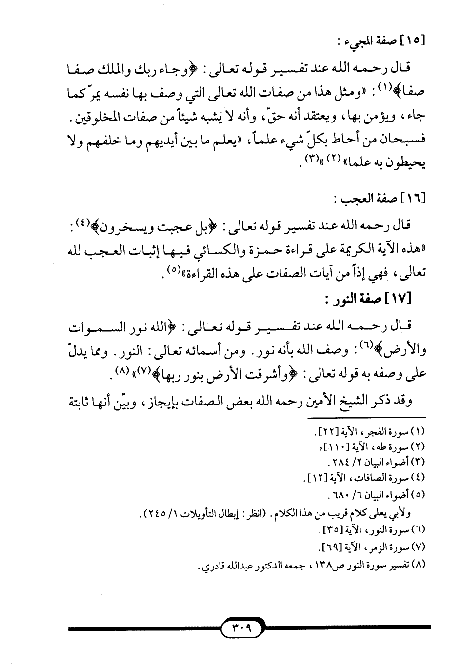 قال -رحمه الله- عند تفسير قوله تعالى: {اللَّهُ نُورُ السَّمَاوَاتِ وَالأرْضِ} 6: وصف الله بأنه نور. ومن أسمائه تعالى: النور. ومما يدلّ على وصفه به قوله تعالى: {وَأَشْرَقَتِ الأرْضُ بِنُورِ رَبِّهَا} 7"8.