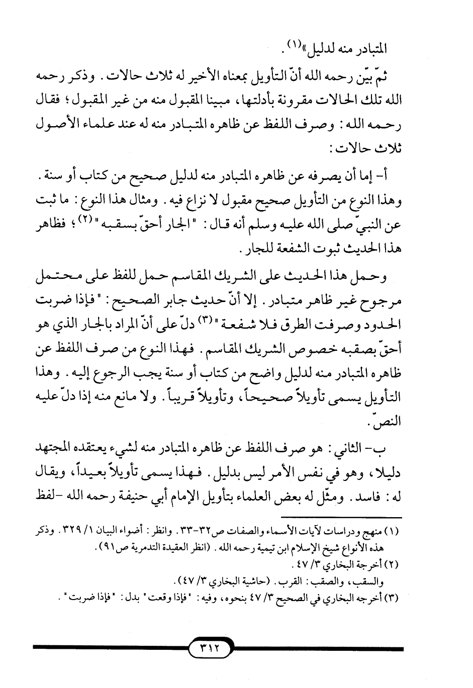 أ-إما أن يصرفه عن ظاهره المتبادر منه لدليل صحيح من كتاب أو سنة. وهذا النوع من التأويل صحيح مقبول لا نزاع فيه. ومثال هذا النوع: ما ثبت عن النبي صلى الله عليه وسلم أنه قال: "الجار أحقّ بسقبه" 2؛ فظاهر هذا الحديث ثبوت الشفعة للجار.