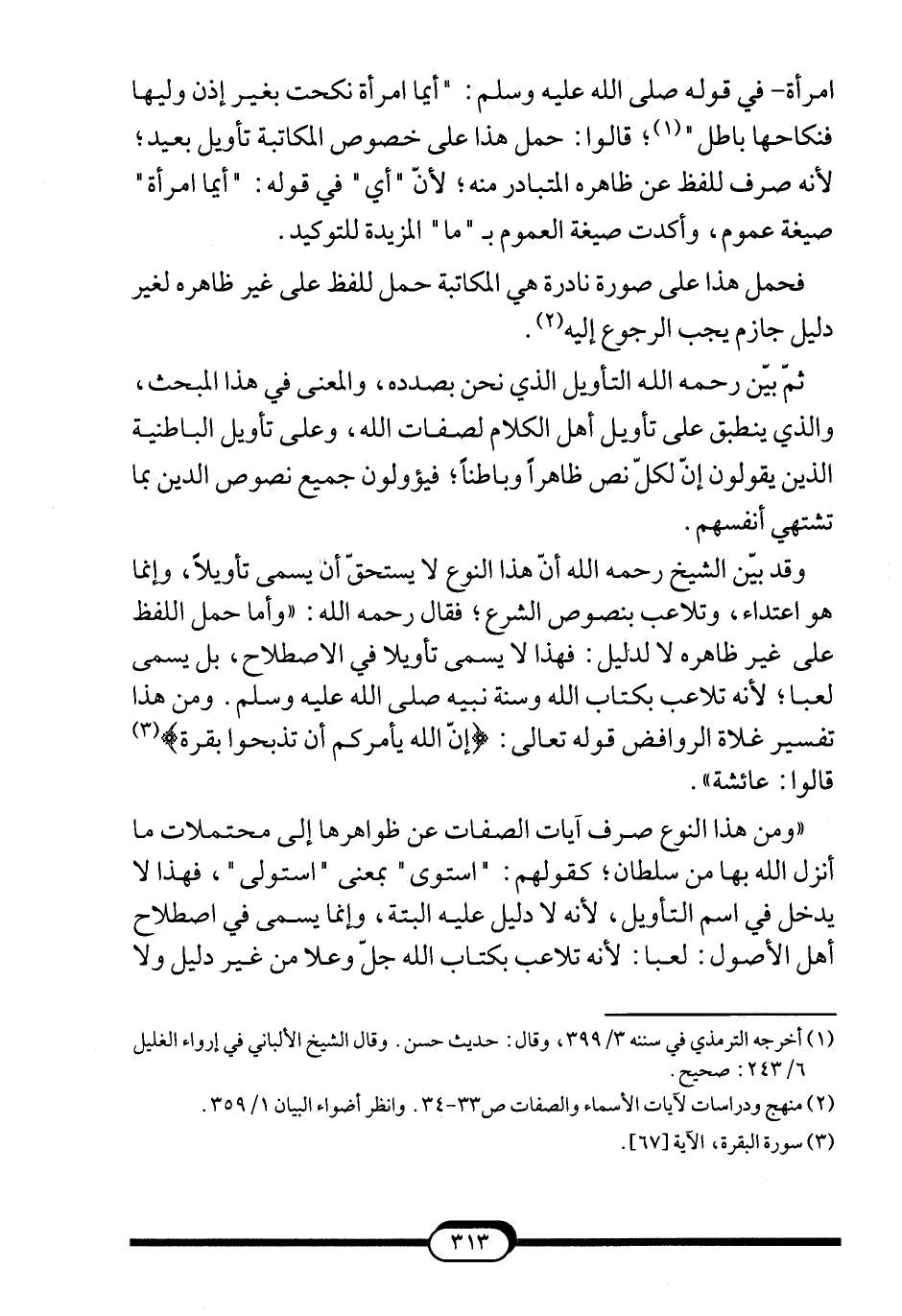 وقد بيّن الشيخ -رحمه الله- أنّ هذا النوع لا يستحقّ أن يسمى تأويلاً، وإنما هو اعتداء، وتلاعب بنصوص الشرع؛ فقال -رحمه الله-: "وأما حمل اللفظ على غير ظاهره لا لدليل: فهذا لا يسمى تأويلا في الاصطلاح، بل يسمى لعبا؛ لأنه تلاعب بكتاب الله وسنة نبيه صلى الله عليه وسلم. ومن هذا تفسير غلاة الروافض قوله تعالى: {إِنَّ اللَّهَ يَأْمُرُكُمْ أَنْ تَذْبَحُوا بَقَرَةً} 3 قالوا: عائشة".