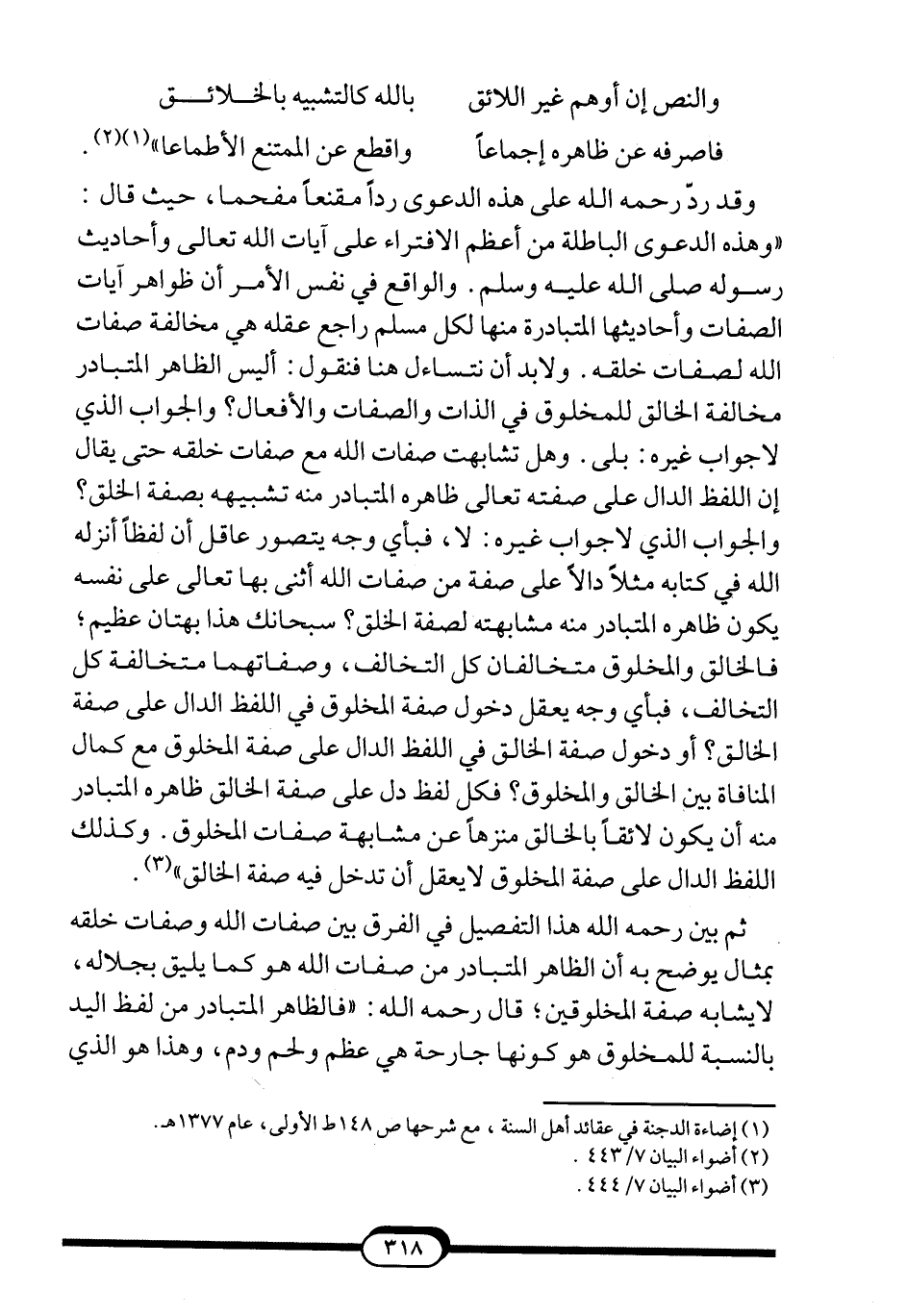 وقد ردّ -رحمه الله- على هذه الدعوى رداً مقنعاً مفحما، حيث قال: "وهذه الدعوى الباطلة من أعظم الافتراء على آيات الله تعالى وأحاديث رسوله صلى الله عليه وسلم. والواقع في نفس الأمر أن ظواهر آيات الصفات وأحاديثها المتبادرة منها لكل مسلم راجع عقله هي مخالفة صفات الله لصفات خلقه. ولا بد أن نتساءل هنا فنقول: أليس الظاهر المتبادر مخالفة الخالق للمخلوق في الذات والصفات والأفعال؟ والجواب الذي لا جواب غيره: بلى. وهل تشابهت صفات الله مع صفات خلقه حتى يقال إن اللفظ الدال على صفته تعالى ظاهره المتبادر منه تشبيهه بصفة الخلق؟ والجواب الذي لا جواب غيره: لا، فبأي وجه يتصور عاقل أن لفظاً أنزله الله في كتابه مثلاً دالاً على صفة من صفات الله أثنى بها تعالى على نفسه يكون ظاهره المتبادر منه مشابهته لصفة الخلق؟ سبحانك هذا بهتان عظيم؛ فالخالق والمخلوق متخالفان كل التخالف، وصفاتهما متخالفة كل التخالف، فبأي وجه يعقل دخول صفة المخلوق في اللفظ الدال على صفة الخالق؟ أو دخول صفة الخالق في اللفظ الدال على صفة المخلوق مع كمال المنافاة بين الخالق والمخلوق؟ فكل لفظ دل على صفة الخالق ظاهره المتبادر منه أن يكون لائقاً بالخالق منزهاً عن مشابهة صفات المخلوق. وكذلك اللفظ الدال على صفة المخلوق لا يعقل أن تدخل فيه صفة الخالق" 3.