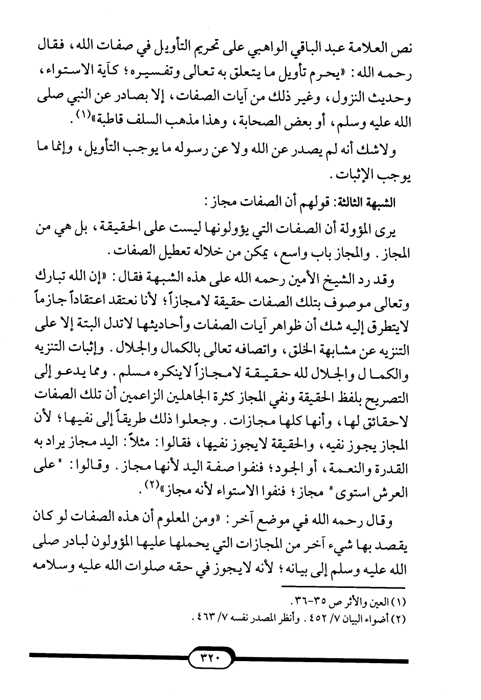 نص العلامة عبد الباقي الواهبي على تحريم التأويل في صفات الله، فقال -رحمه الله-: "يحرم تأويل ما يتعلق به تعالى وتفسيره؛ كآية الاستواء، وحديث النزول، وغير ذلك من آيات الصفات، إلا بصادر عن النبي صلى الله عليه وسلم, أو بعض الصحابة، وهذا مذهب السلف قاطبة"1.