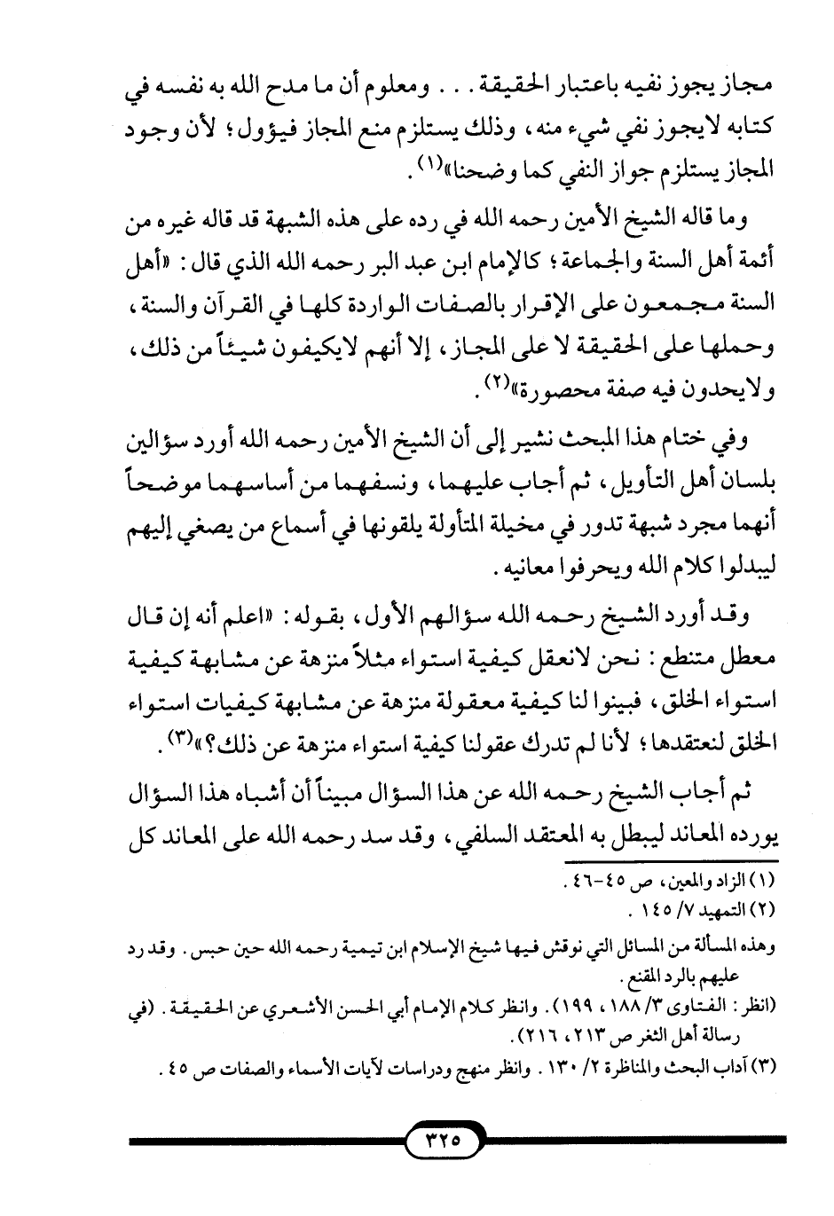 وما قاله الشيخ الأمين -رحمه الله- في رده على هذه الشبهة قد قاله غيره من أئمة أهل السنة والجماعة؛ كالإمام ابن عبد البر -رحمه الله- الذي قال: "أهل السنة مجمعون على الإقرار بالصفات الواردة كلها في القرآن والسنة، وحملها على الحقيقة لا على المجاز، إلا أنهم لا يكيفون شيئاً من ذلك، ولا يحدون فيه صفة محصورة" 2.