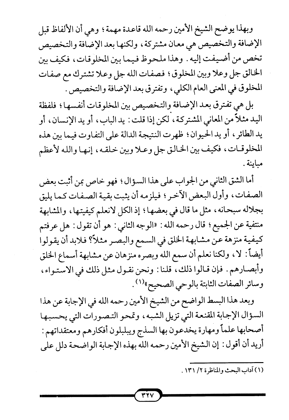 وبهذا يوضح الشيخ الأمين -رحمه الله- قاعدة مهمة؛ وهي أن الألفاظ قبل الإضافة والتخصيص هي معان مشتركة، ولكنها بعد الإضافة والتخصيص تخص من أضيفت إليه. وهذا ملحوظ فيما بين المخلوقات، فكيف بين الخالق جل وعلا وبين المخلوق؛ فصفات الله جل وعلا تشترك مع صفات المخلوق في المعنى العام الكلي، وتفترق بعد الإضافة والتخصيص.