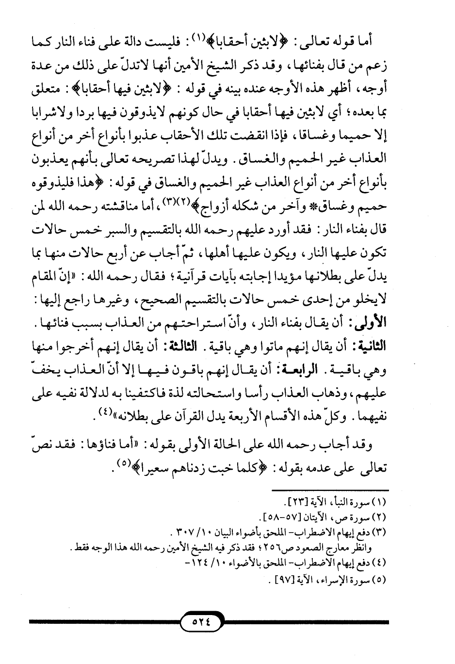 الوجه الثالث: أنّ قوله: {إِلاّ مَا شَاءَ اللَّهُ} 7فيه إجمال، وقد جاءت الآيات والأحاديث الصحيحة مصرحة بأنهم خالدون فيها أبدا، وظاهرها أنه خلود لا انقطاع له. والظهور من المرجحات، فالظاهر مقدم على المجمل كما تقرر في الأصول"8.
