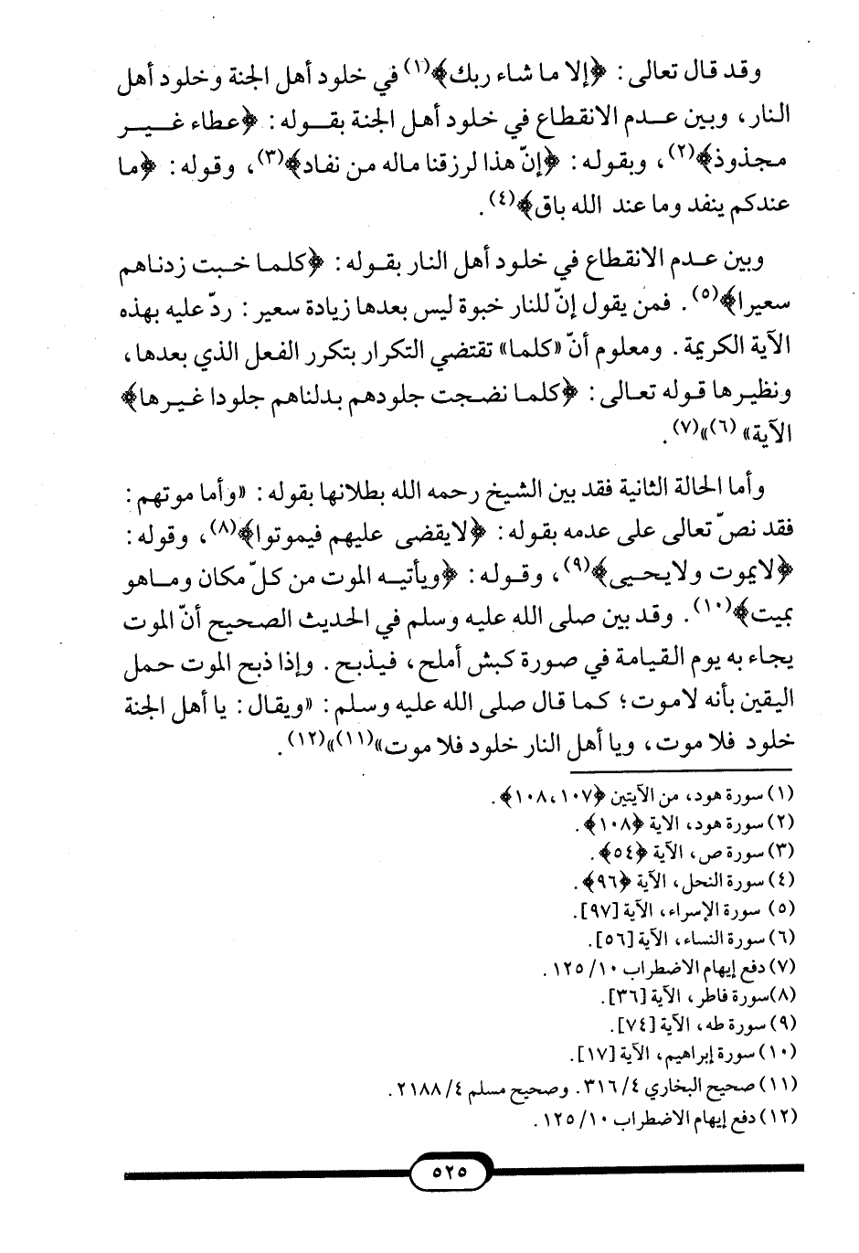 "والاستثناء بالمشيئة كما صرح به في أهل النار صرح به كذلك في أهل الجنة، مع أنه لا يقول أحد ممن يقول بانقطاع النار بانقطاع الجنة؛ كما قال تعالى هنا في سورة هود: {خَالِدِينَ فِيهَا مَا دَامَتِ السَّمَاوَاتُ وَالأرْضُ إِلاّ مَا شَاءَ رَبُّكَ عَطَاءً غَيْرَ مَجْذُوذٍ} 1؛ وهذه المشيئة مجملة، لم نعرف ما أخرجته. والأدلة المنفصلة وضحت أنّ المشيئة اقتضت الخلود الأبدي؛ كما قال تعالى في أهل الجنة: {إِنَّ هَذَا لَرِزْقُنَا مَا لَهُ مِنْ نَفَادٍ} 2، وقال تعالى: {مَا عِنْدَكُمْ يَنْفَدُ وَمَا عِنْدَ اللَّهِ بَاقٍ وَلَنَجْزِيَنَّ الَّذِينَ صَبَرُوا أَجْرَهُمْ بِأَحْسَنِ مَا كَانُوا يَعْمَلُونَ} 3، وقال تعالى: {إِنَّ الْمُجْرِمِينَ فِي عَذَابِ جَهَنَّمَ خَالِدُونَ لا يُفَتَّرُ عَنْهُمْ وَهُمْ فِيهِ مُبْلِسُونَ} 4، وقال تعالى: {وَالَّذِينَ يَقُولُونَ رَبَّنَا اصْرِفْ عَنَّا عَذَابَ جَهَنَّمَ إِنَّ عَذَابَهَا كَانَ غَرَاماً} 5، وقال تعالى: {خَالِدِينَ فِيهَا لا يُخَفَّفُ عَنْهُمُ الْعَذَابُ وَلا هُمْ يُنْظَرُونَ} 6، وقال تعالى: {مَأْوَاهُمْ جَهَنَّمُ كُلَّمَا خَبَتْ زِدْنَاهُمْ سَعِيراً} 7، والفعل بعد كلما يتكرر بتكررها: فمن ادعى خبوة للنار نهائية تفنى بها ليس بعده سعير، يردّ عليه بهذه الآية. ولو قيل للعبد: كلما جاء أحد أكرمه لزمه ذلك، ولا حقّ له أن يتعذر بأنه لم يفهم التكرار"8.