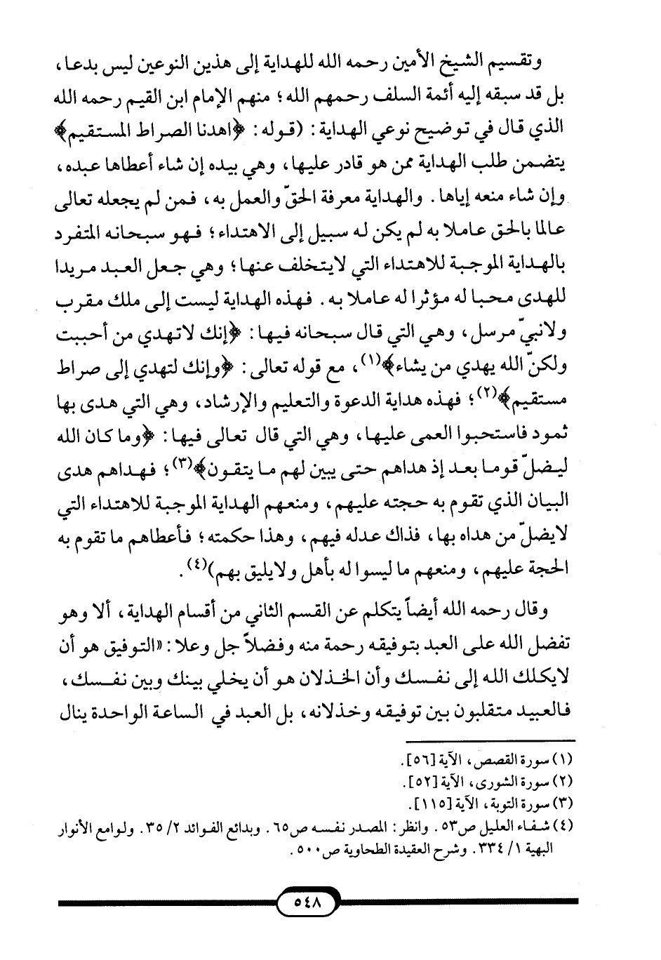 وقد أوضح الشيخ الأمين -رحمه الله- نوعي الهداية، فقال -رحمه الله-: "إنّ الهدى يستعمل في القرآن استعمالين؛ أحدهما عام، والثاني خاص. أما الهدى العام فمعناه إبانة طريق الحقّ وإيضاح المحجة سواء سلكها المبين له أم لا. ومنه بهذا المعنى قوله تعالى: {وَأَمَّا ثَمُودُ فَهَدَيْنَاهُمْ} 4؛ أي بينا لهم طريق الحقّ على لسان نبينا صالح عليه وعلى نبينا الصلاة والسلام، مع أنهم لم يسلكوها، بدليل قوله عز وجل {فَاسْتَحَبُّوا الْعَمَى عَلَى الْهُدَى} 5.