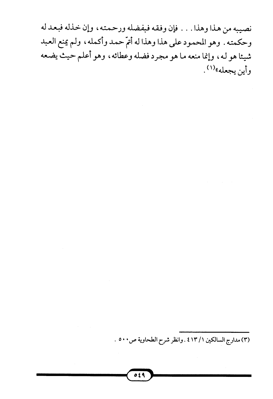 "فملكه تعالى وحده للتوفيق والهداية هو الحجة البالغة على خلقه؛ يعني فمن هديناه وتفضلنا عليه بالتوفيق فهو فضل منا ورحمة. ومن لم نفعل له ذلك فهو عدل منا وحكمة؛ لأنه لم يكن له ذلك دينا علينا ولاواجبا مستحقا يستحقه علينا بل إن أعطينا ذلك ففضل، وإن لم نعطه فعدل"7.