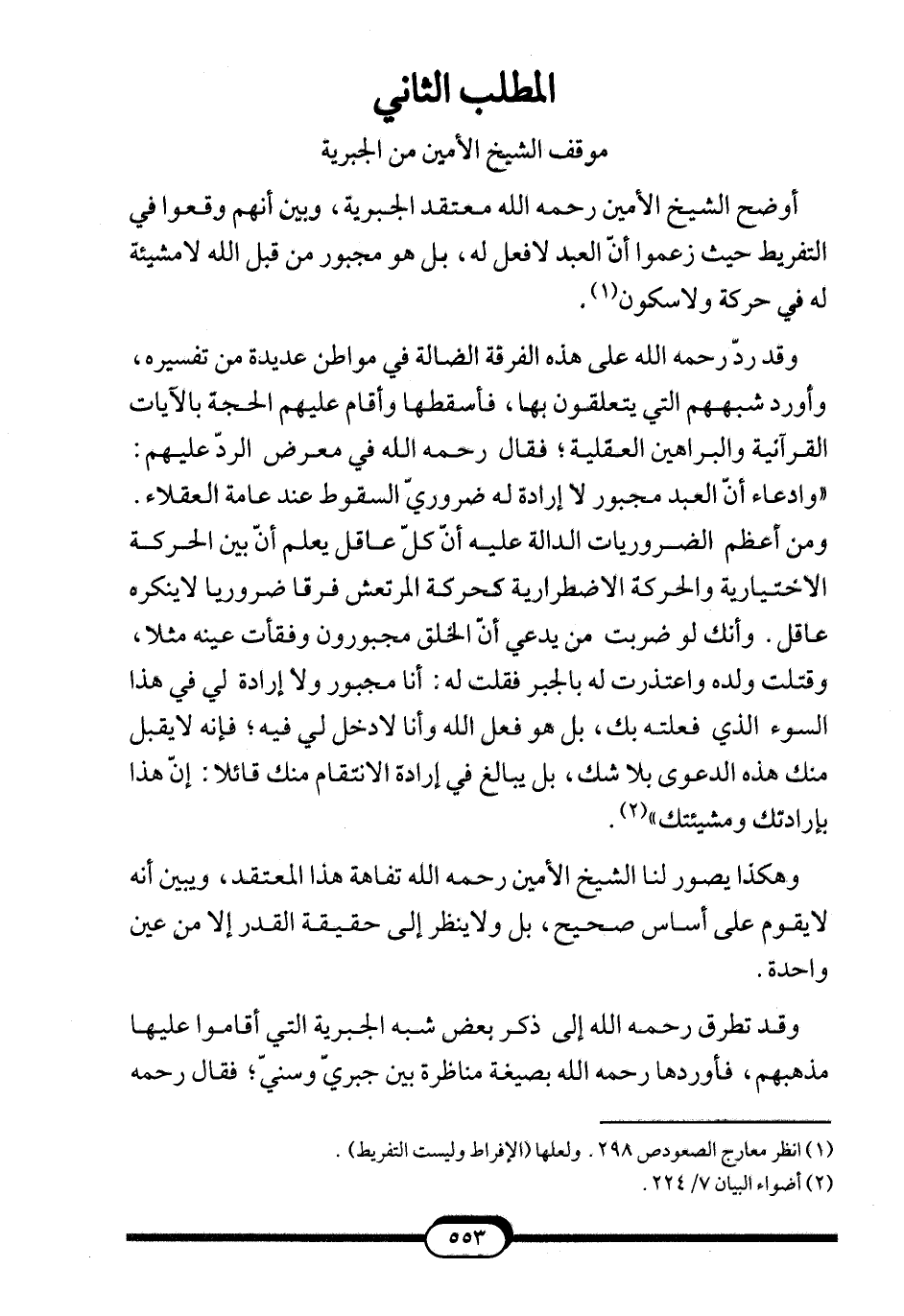 وبهذه الخلاصة الجامعة أبرز الشيخ الأمين -رحمه الله- عقيدة أهل السلف في القدر موضحا وسطية أهل السنة والجماعة بين الغالين والجافين.