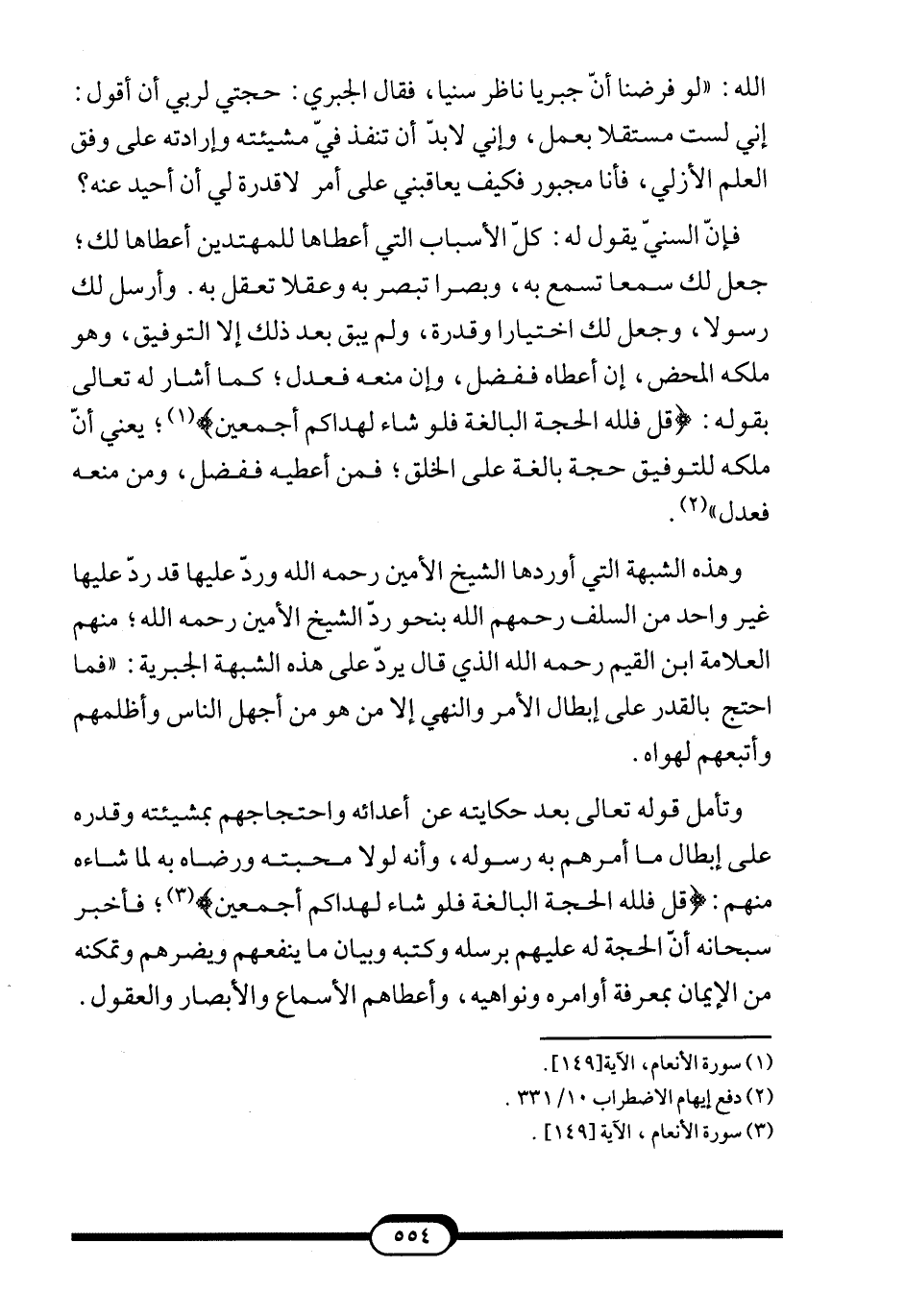 فارقنا الجبرية بإثبات أنّ العبد كاسب فاعل صانع عامل، والجبر المعقول الذي أنكره سلف الأمة وعلماء السنة هو أن يكون الفعل صادرا على الشيء من غير إرادة ولا مشيئة ولا اختيار؛ مثل حركة الأشجار بهبوب الرياح"1.
