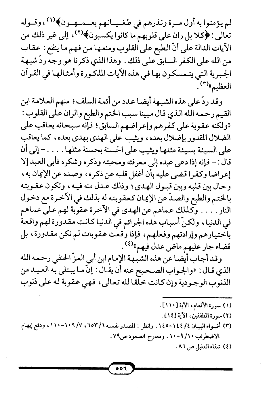 وتأمل قوله تعالى بعد حكايته عن أعدائه واحتجاجهم بمشيئته وقدره على إبطال ما أمرهم به رسوله، وأنه لولا محبته ورضاه به لما شاءه منهم: {قُلْ فَلِلَّهِ الْحُجَّةُ الْبَالِغَةُ فَلَوْ شَاءَ لَهَدَاكُمْ أَجْمَعِينَ} 3؛ فأخبر سبحانه أنّ الحجة له عليهم برسله وكتبه وبيان ما ينفعهم ويضرهم وتمكنه من الإيمان بمعرفة أوامره ونواهيه، وأعطاهم الأسماع والأبصار والعقول.