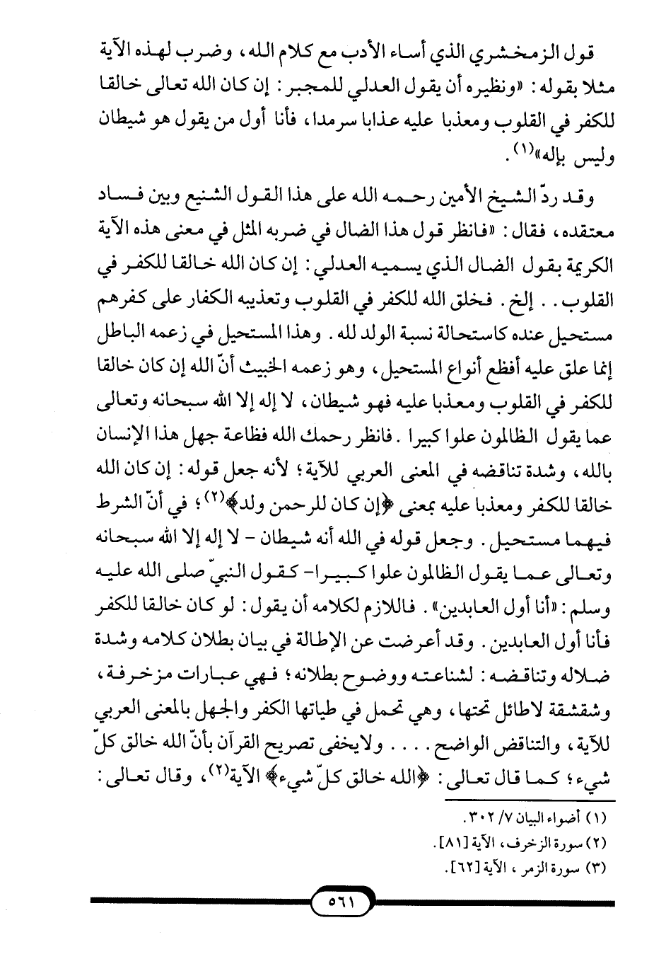 وهذا المعتقد الذي قرره الشيخ الأمين -رحمه الله- هو عين ما قرره قبله أئمة السلف رحمهم الله؛ مثل شيخ الإسلام ابن تيمية -رحمه الله- الذي قال: "إنّ أئمة أهل السنة يقولون: إنّ الله خالق أفعال العباد، كما أنّ الله خالق كلّ شيء، وأنه تعالى خالق الأشياء بالأسباب، وأنه تعالى خلق للعبد قدرة بها يكون فعله، وأنّ العبد فاعل لفعله حقيقة"3.