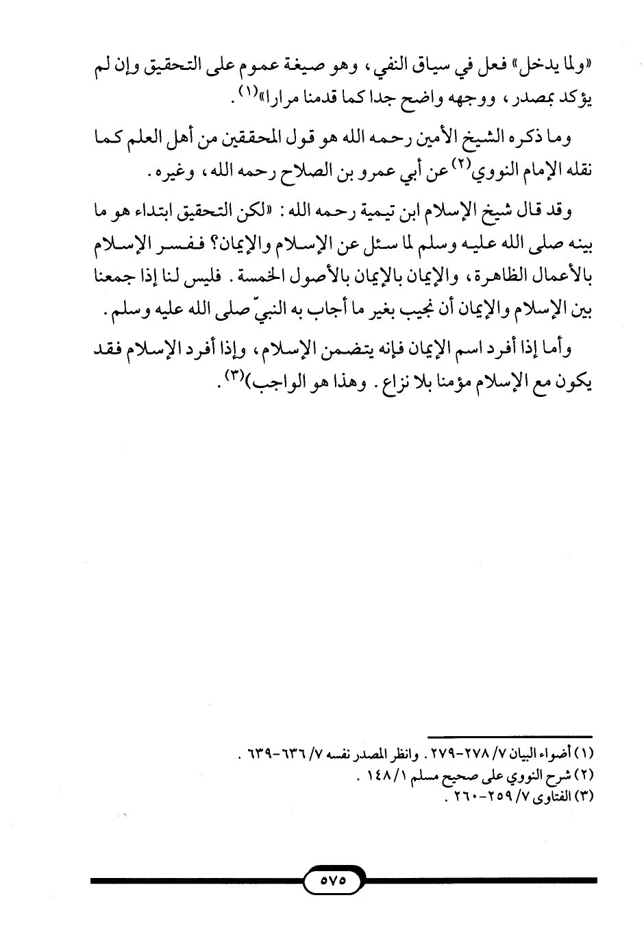 "ظاهره المغايرة بين الإيمان والإسلام. وقد دلّ بعض الآيات على اتحادهما؛ كقوله تعالى: {فأَخْرَجْنَا مَنْ كَانَ فِيهَا مِنَ الْمُؤْمِنِينَ فَمَا وَجَدْنَا فِيهَا غَيْرَ بَيْتٍ مِنَ الْمُسْلِمِينَ} 3. ولا منافاة في ذلك؛ فإنّ الإيمان يطلق تارة على جميع ما يطلق عليه الإسلام من الاعتقاد والعمل؛ كما ثبت في
