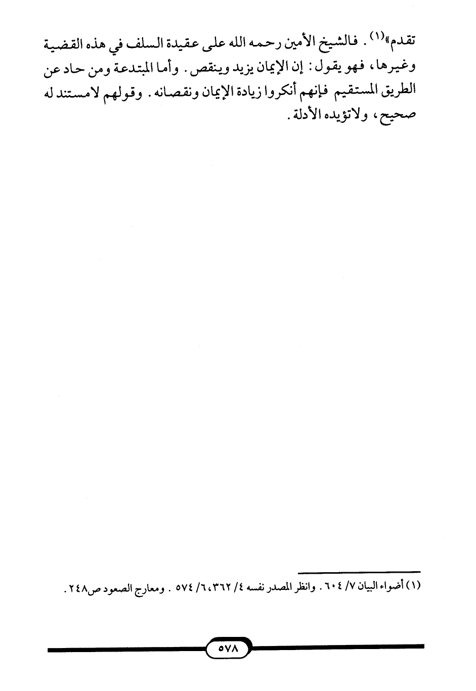 وقد أوضح الشيخ الأمين –رحمه الله- هذه المسألة، وبين أنّ الإيمان يزيد وينقص؛ يزيد بالطاعة، وينقص بالمعصية.