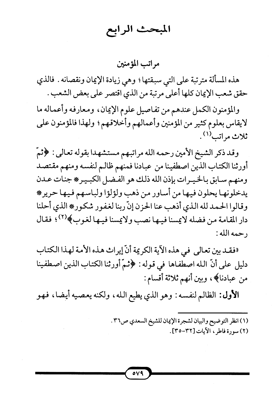 وقال -رحمه الله- في موضع آخر بعدما ذكر الآيات المتقدمة: "وتدل هذه الآيات بدلالة الالتزام على أنه ينقص أيضاً، لأن كل ما يزيد ينقص. وجاء مصرحاً به في أحاديث الشفاعة الصحيحة كقوله: "يخرج من النار من قال لا إله إلا الله، وفي قلبه مثقال حبة من إيمان "7ونحو ذلك"8. وقال -رحمه الله- أيضاً: "والحق الذي لا شك فيه أن الإيمان يزيد وينقص كما عليه أهل السنة والجماعة. وقد دل عليه الوحي من الكتاب والسنة، كما