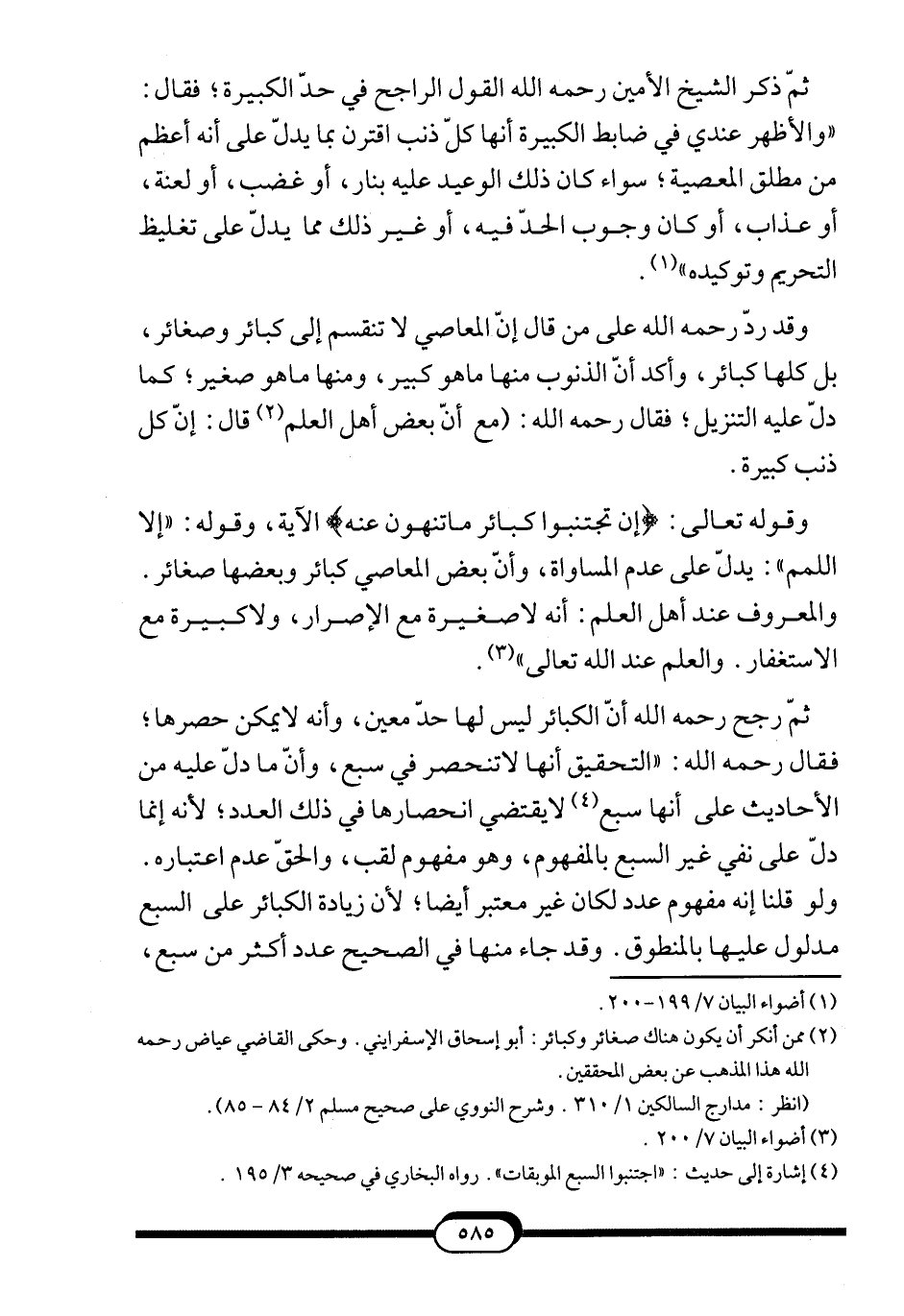 وأوضح الشيخ الأمين –رحمه الله- انقسام الذنوب إلى صغائر وكبائر، وبين معنى الكبائر، وهل تنحصر بعدد معين، وأكد أنّ اجتناب الكبائر مكفر للصغائر؛ فقال -رحمه الله- عند قوله تعالى: {مَالِ هَذَا الْكِتَابِ لا يُغَادِرُ صَغِيرَةً وَلا كَبِيرَةً إِلاَّ أَحْصَاهَا} 5: