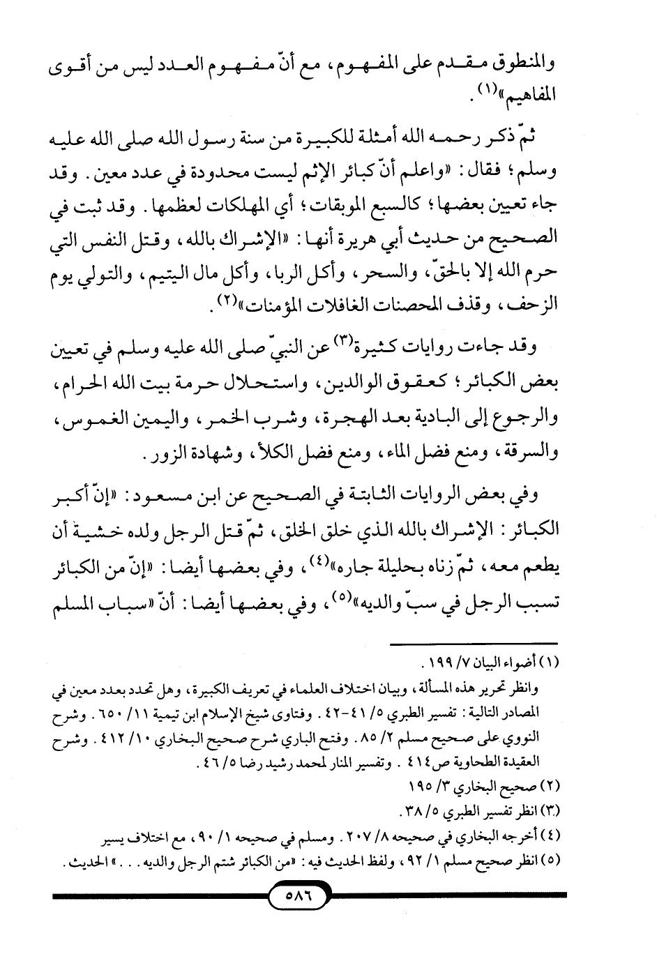 وقال بعضهم5: هي كلّ ذنب جاء الوعيد عليه بنار أو لعنة أو غضب أو عذاب. واختار بعض المتأخرين6حدّ الكبيرة بأنها هي كل ذنب دلّ على عدم اكتراث صاحبه بالدين ... وعن ابن عباس أنّ الكبائر أقرب إلى السبعين منها إلى السبع. وعنه أيضا: أنها أقرب إلى سبعمائة منها إلى سبع7"8.