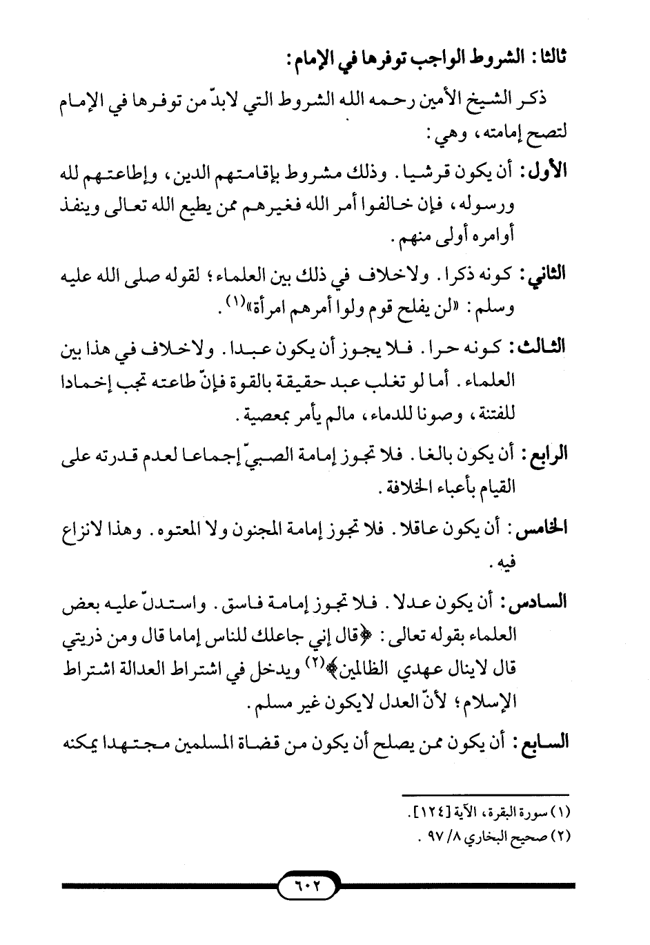 قال الشيخ الأمين -رحمه الله-: "من الواضح المعلوم من ضرورة الدين أنّ المسلمين يجب عليهم نصب إمام تجتمع به الكلمة، وتنفذ به أحكام الله في أرضه. ولم يخالف في هذا إلا من لايعتدّ به.. وأكثر العلماء على أنّ وجوب الإمامة الكبرى بطريق الشرع؛ كما دلت عليه الآية المتقدمة1 وأشباهها وإجماع الصحابة رضي الله عنهم، ولأن الله تعالى قد يزع بالسلطان ما لايزعه بالقرآن؛ كما قال تعالى: {لَقَدْ أَرْسَلْنَا رُسُلَنَا بِالْبَيِّنَاتِ وَأَنْزَلْنَا مَعَهُمُ الْكِتَابَ وَالْمِيزَانَ لِيَقُومَ النَّاسُ بِالْقِسْطِ وَأَنْزَلْنَا الْحَدِيدَ فِيهِ بَأْسٌ شَدِيدٌ وَمَنَافِعُ لِلنَّاسِ} 2؛ لأنّ قوله: {وَأَنْزَلْنَا الْحَدِيدَ فِيهِ بَأْسٌ شَدِيدٌ} فيه إشارة إلى إعمال السيف عند الإباء بعد إقامة الحجة"3.