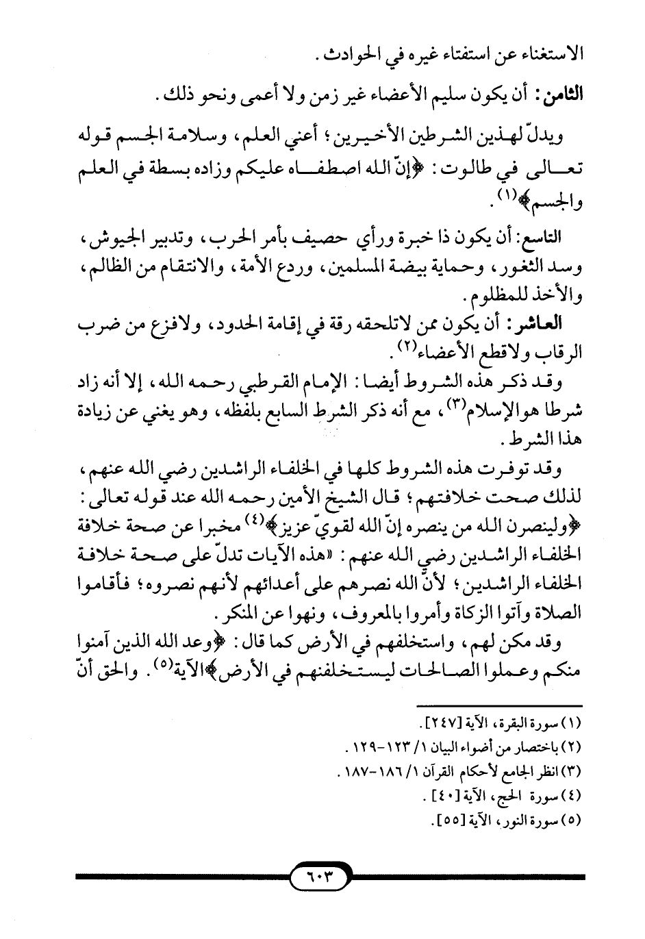 وقد ذكر هذه الأمور التي تنعقد بها الإمامة الإمام القرطبي3 -رحمه الله-.