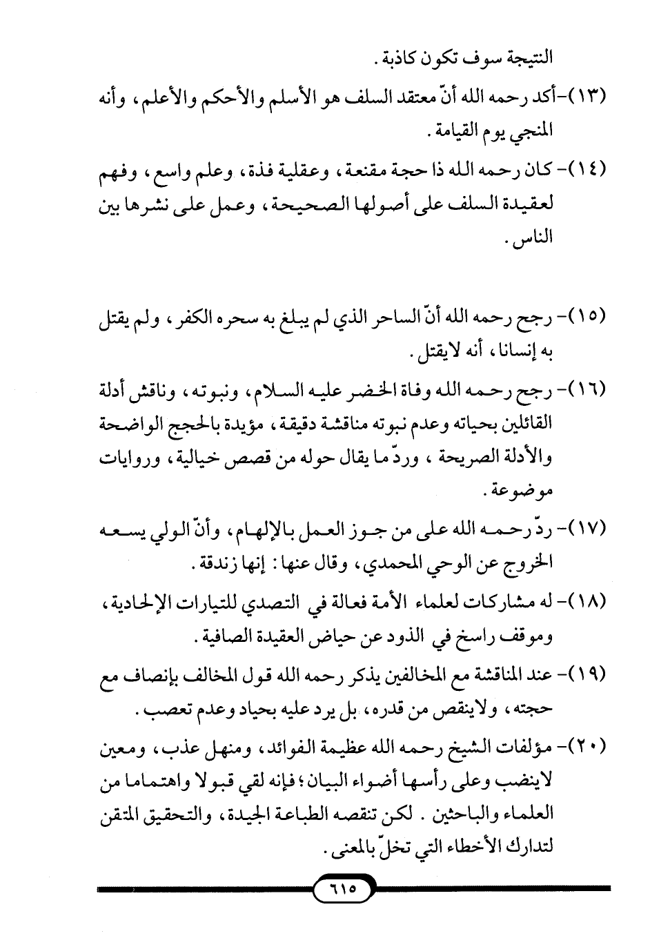 (1) - إنّ عقيدة الشيخ -رحمه الله- هي عقيدة السلف الصالح التي ترتكز على الوحيين، الكتاب والسنة.