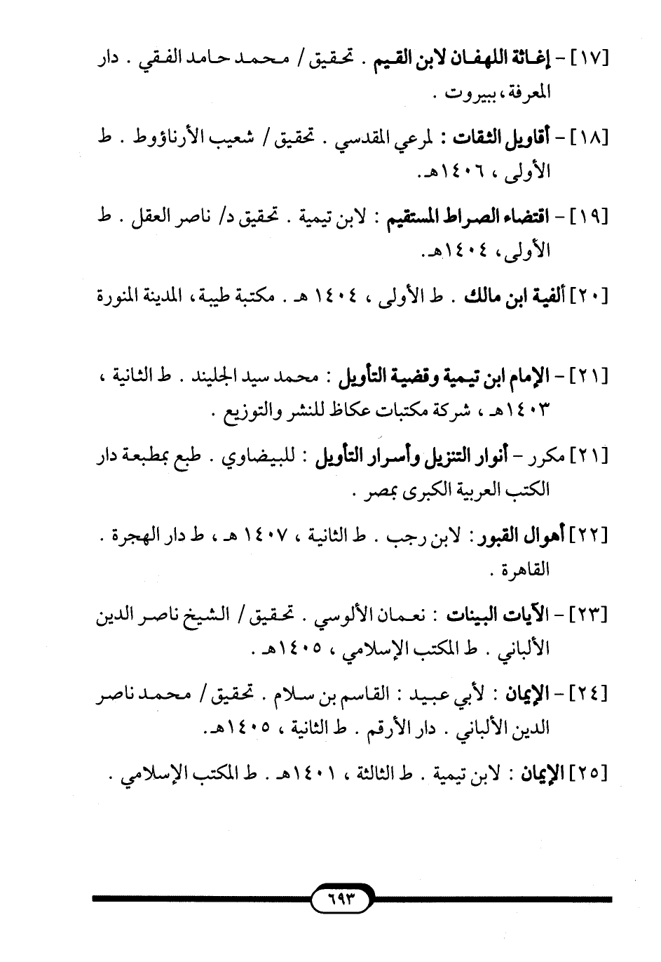 1- الإبانة: للأشعري. تحقيق/ عبد القادر الأرناؤوط. مكتبة دار البيان الأولى، عام 1401هـ.
