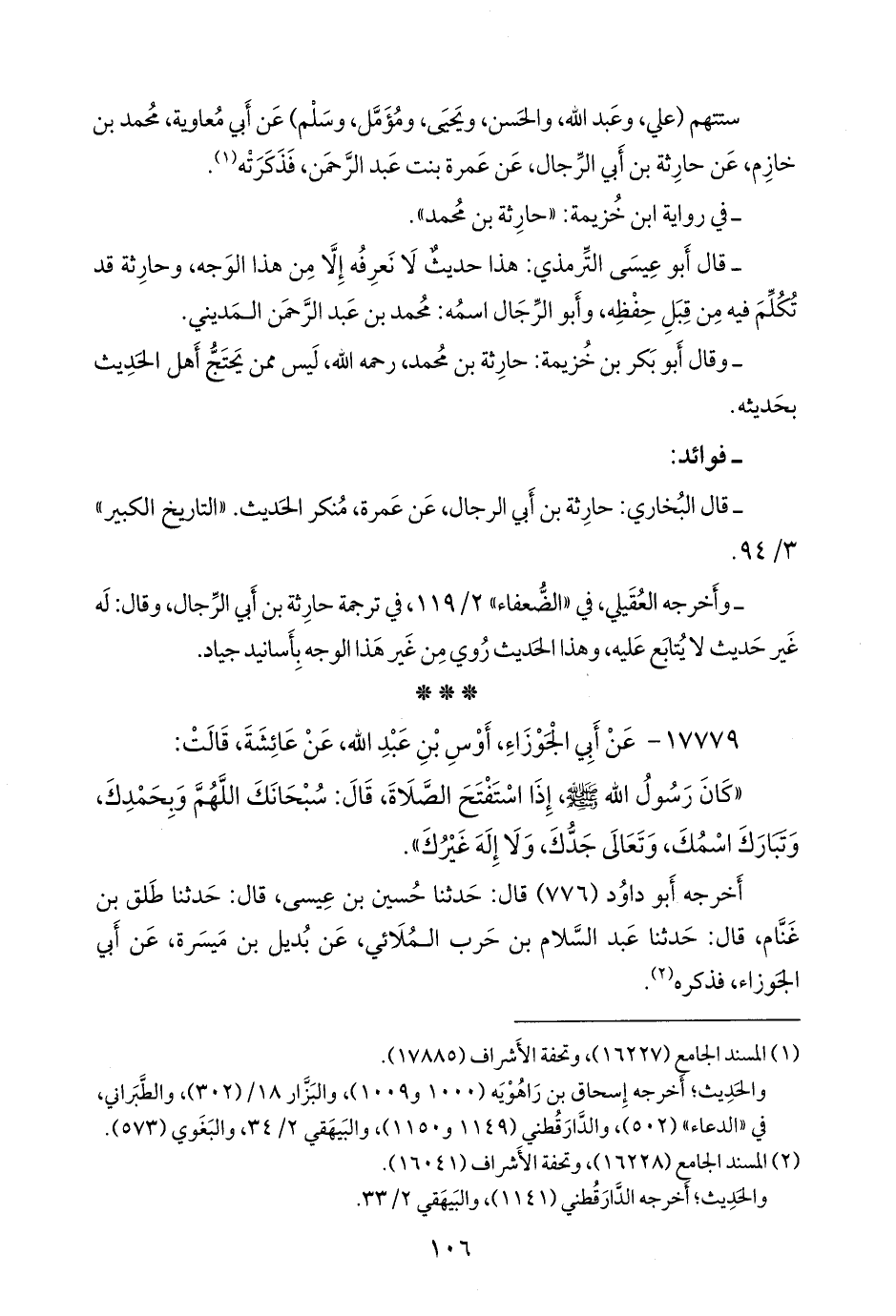 - قلنا: إِسناده ضعيفٌ؛ قال البخاري: حارثة بن أبي الرجال، عن عمرة، منكر الحديث. «التاريخ الكبير» ٣/ ٩٤.
