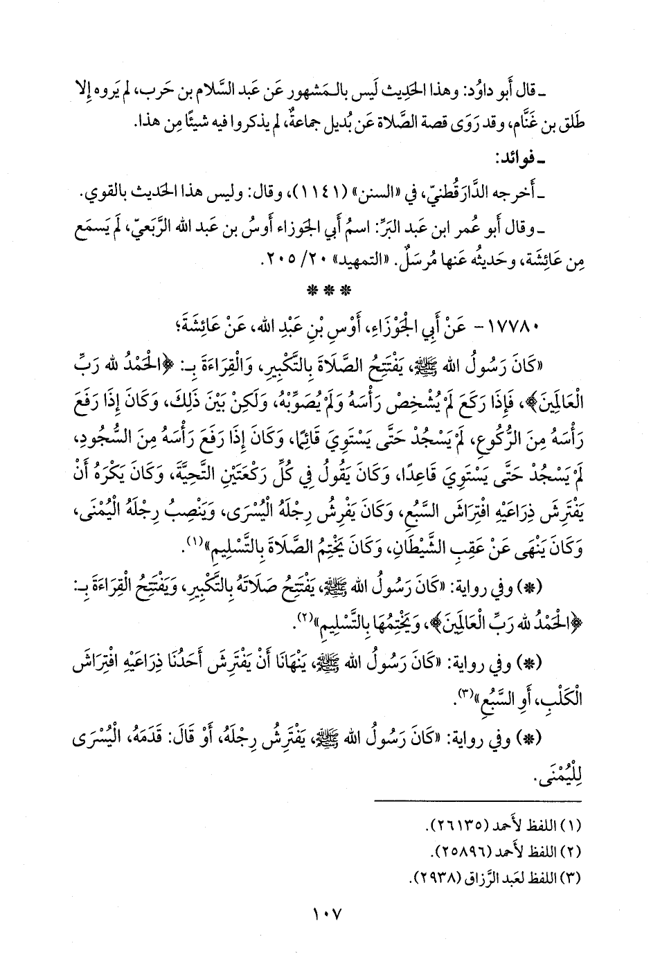 «كان رسول الله صَلى الله عَليه وسَلم يفتتح الصلاة بالتكبير، والقراءة بـ: {الحمد لله رب العالمين}، فإذا ركع لم يشخص رأسه ولم يصوبه، ولكن بين ذلك، وكان إذا رفع رأسه من الركوع، لم يسجد حتى يستوي قائما، وكان إذا رفع رأسه من السجود، لم يسجد حتى يستوي قاعدا، وكان يقول في كل ركعتين التحية، وكان يكره أن يفترش ذراعيه افتراش السبع، وكان يفرش رجله اليسرى، وينصب رجله اليمنى، وكان ينهى عن عقب الشيطان، وكان يختم الصلاة بالتسليم» (¬١).
